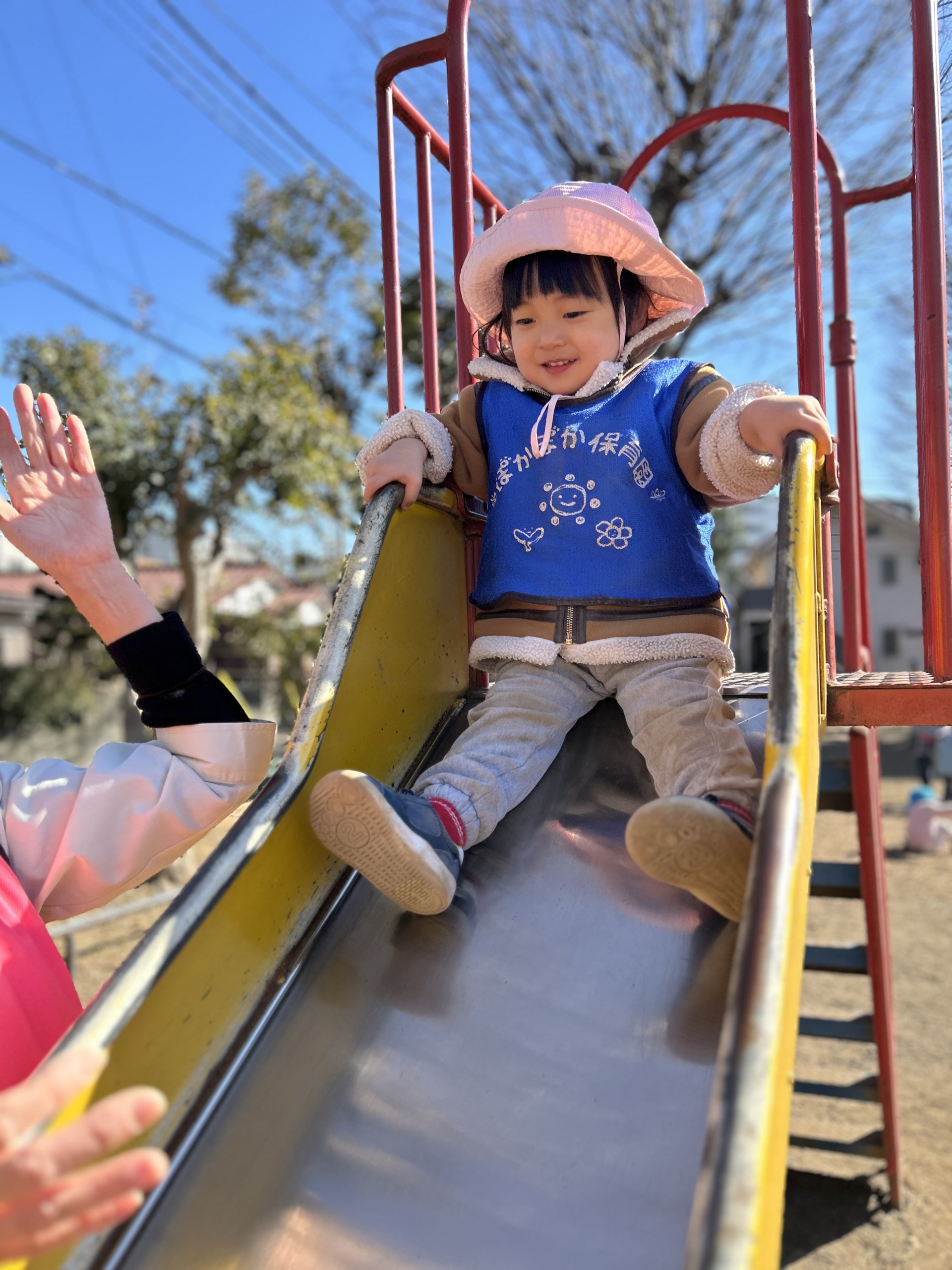 階段を一段ずつ上り、「しゅー!」と声を出しながら滑ります。