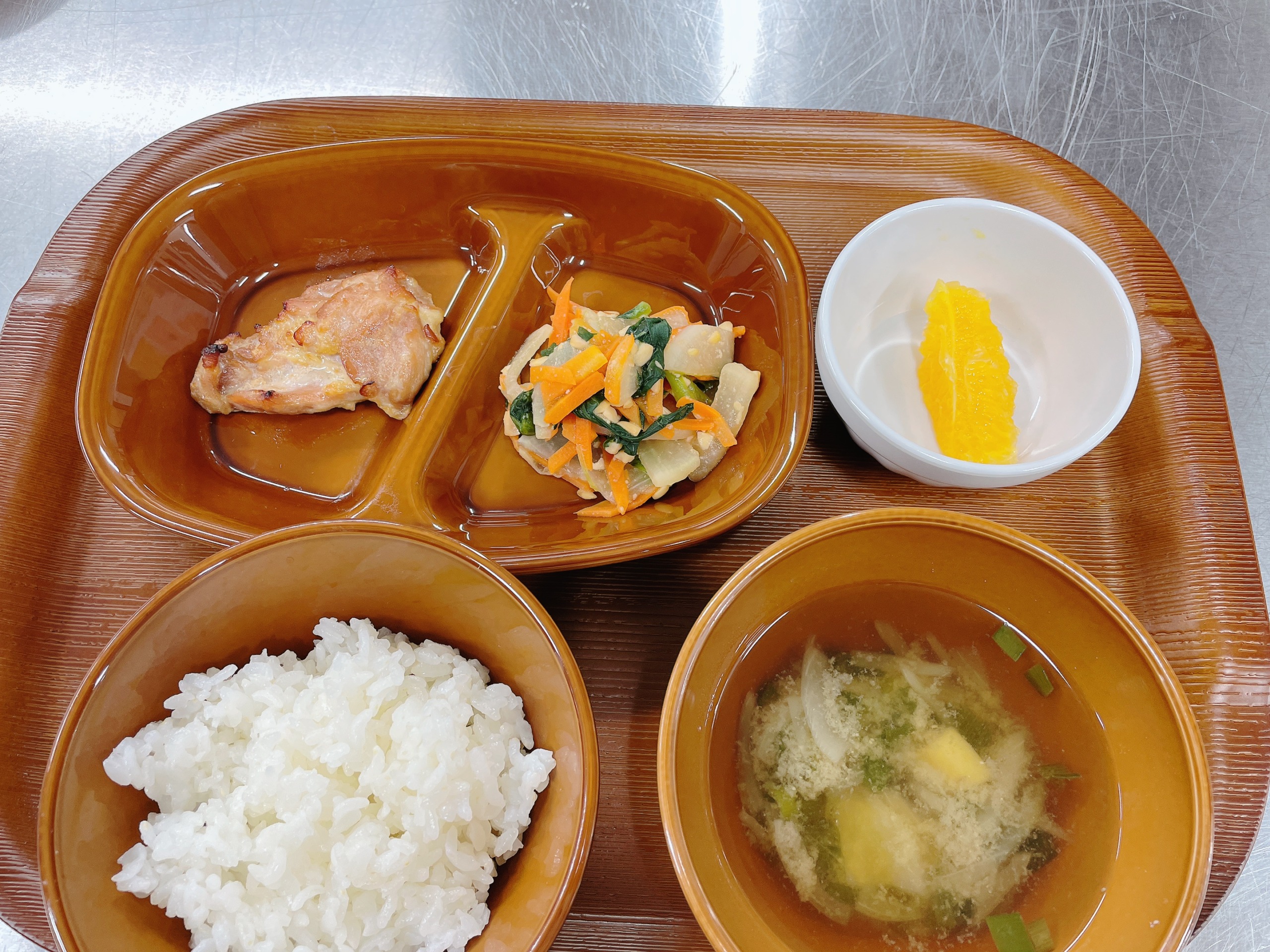 鶏もも肉を醤油・みりん・さとう・生姜にしっかり漬け込み、弱火でじっくり焼き上げました。こんがり照りのついた焼き目に「おいしそう!」と目を輝かせ、甘辛い味わいにおかわりコールが鳴りやまず、子どもに大人気です。