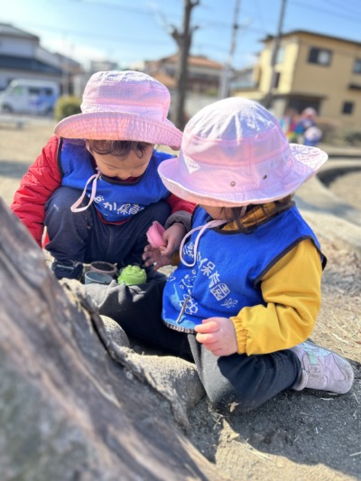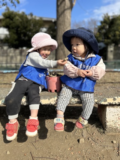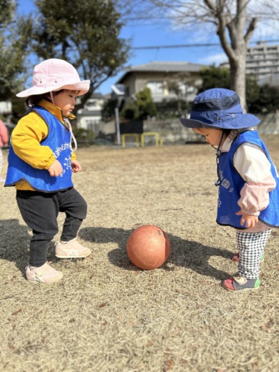 公園では0歳児さんと1歳児さんが一緒に遊びました。