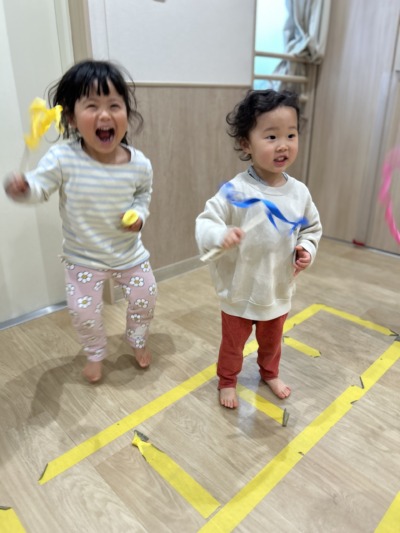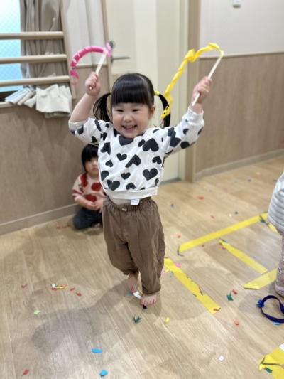 「びりびりできるかな?」と保育者が声をかけると、「できた!」と嬉しそうな声。