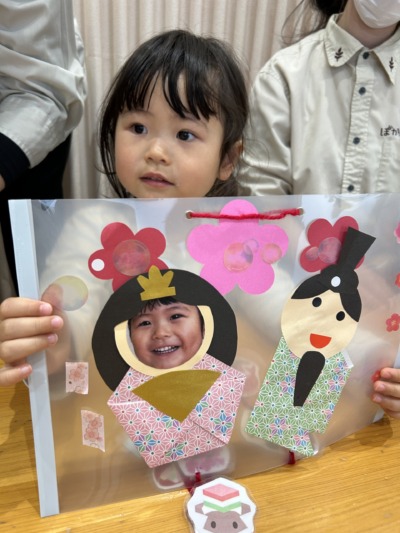 完成したお雛様を見て「できた!」と誇らしげな笑顔。