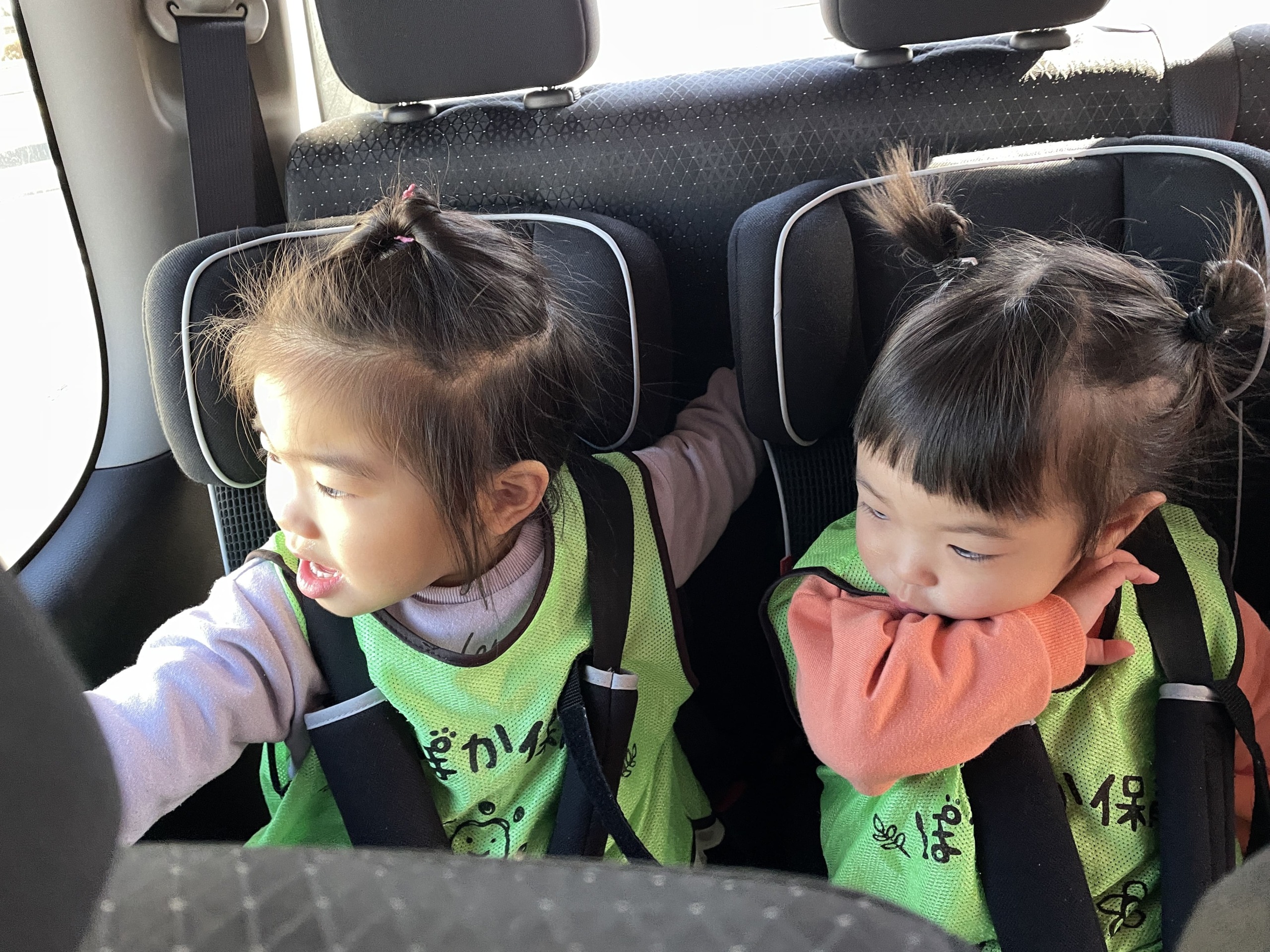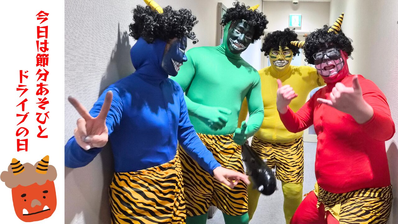 今日は節分の行事に向けて、1歳児さん、2歳児さんのみんなで車に乗って楽しいドライブをしながら大会議室へ向かいました。