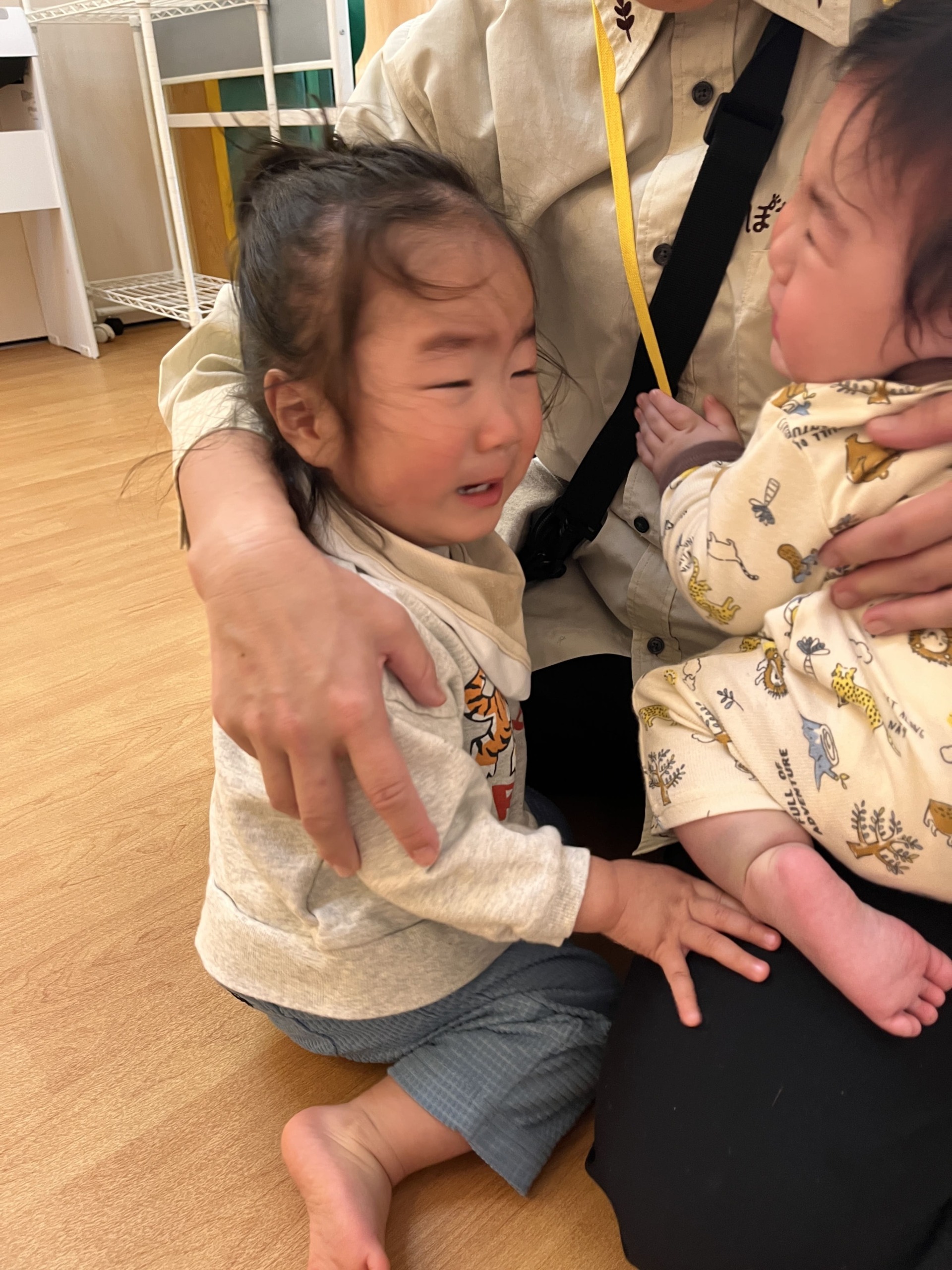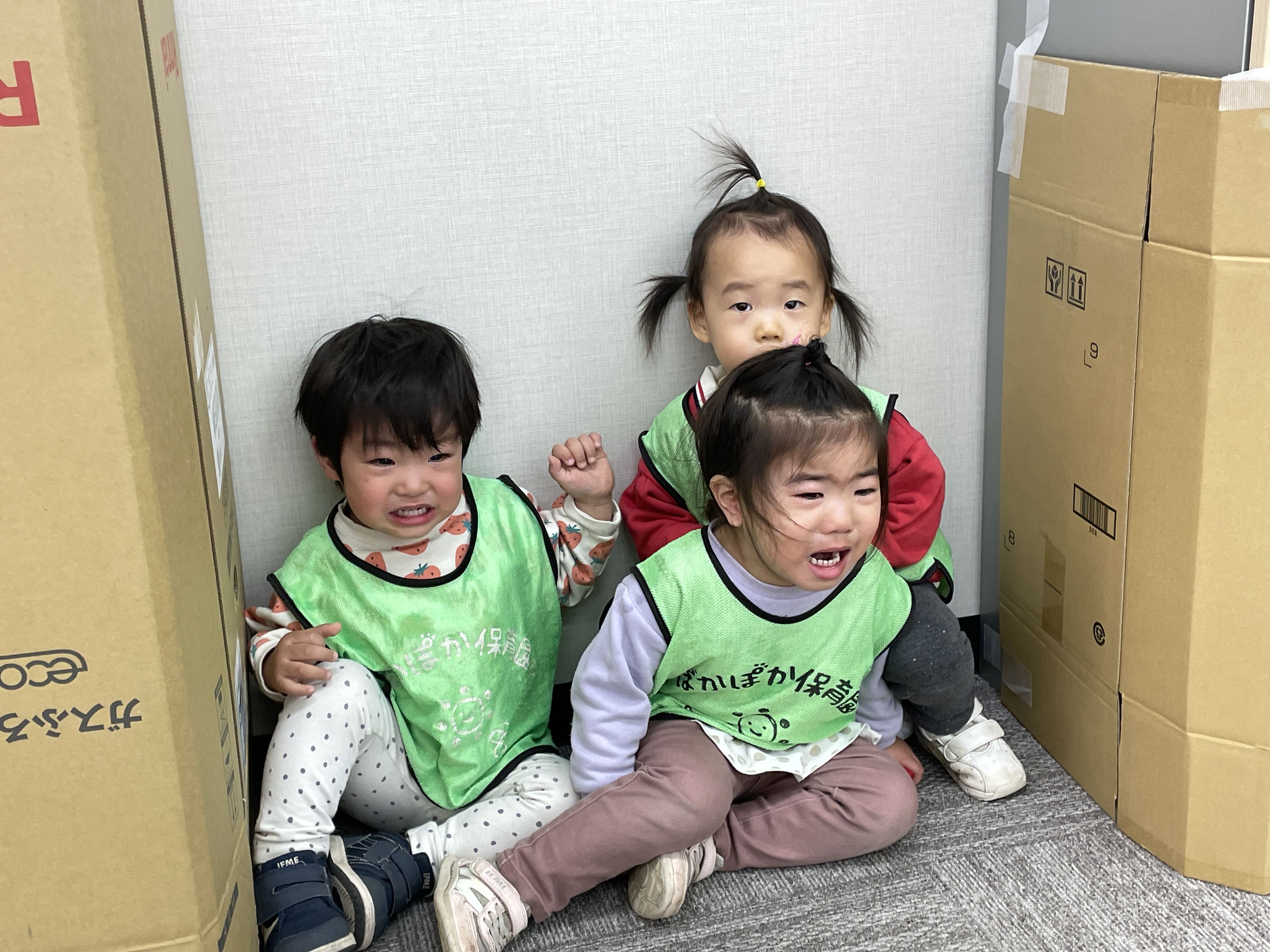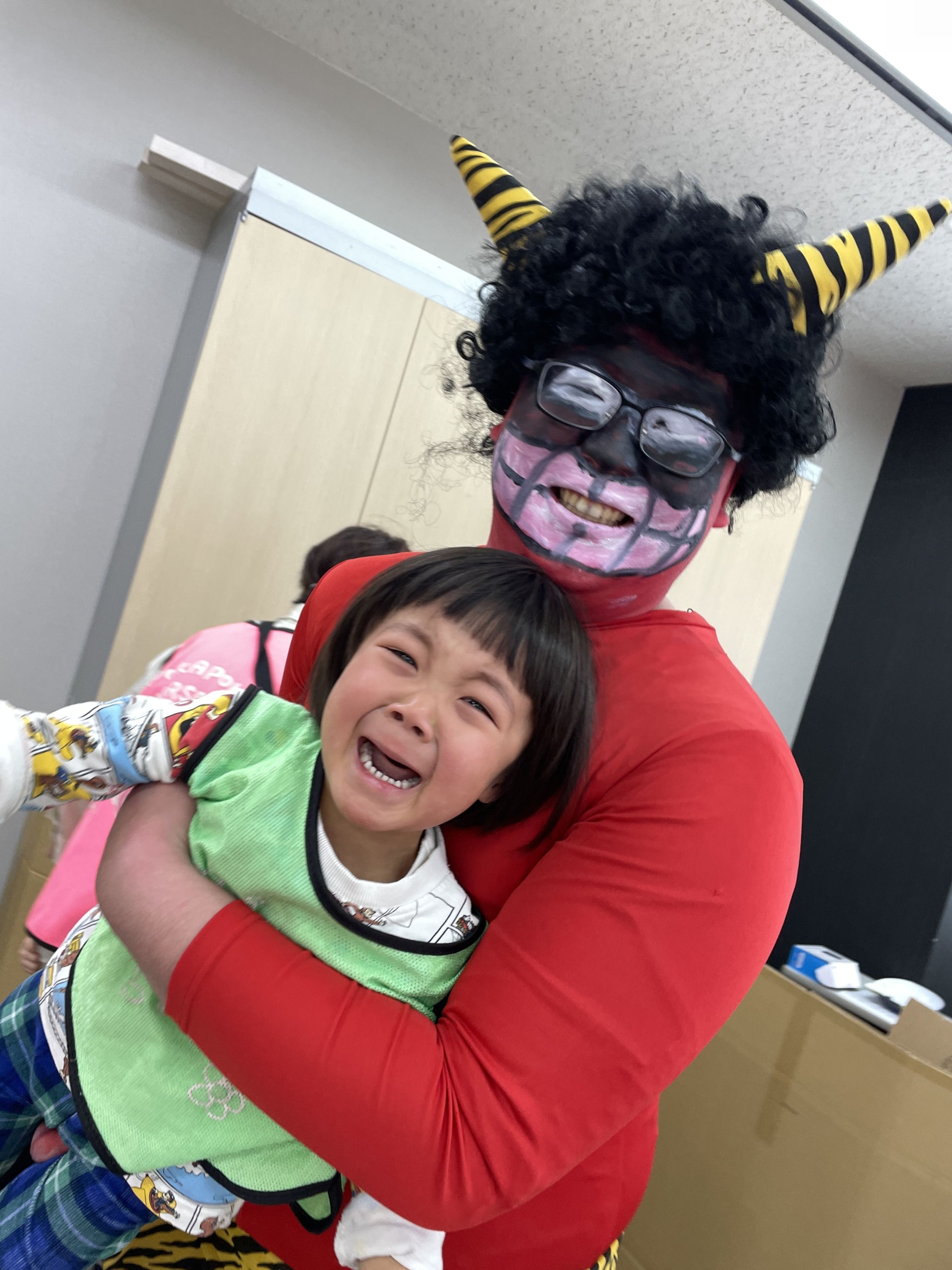 いざ鬼が登場すると、お部屋の隅に逃げて小さく丸まり身を隠すお友だち先生にぎゅっと抱きつくお友だち、目に涙をためて固まってしまうお友だちと、反応もさまざまでした。鬼がそっと近づいて抱き上げられてびっくり、さらに先生が鬼に変身すると「先生が鬼になっちゃった!どこにいったの?」と、心配と怖さが入り混じった表情が見られました。紅白玉を投げると鬼がさっと逃げていき、ドアの方を見て安心するお友だちもいれば、気持ちを切り替えてニッコリ笑顔になるお友だち、ドキドキが続いて手が少し震えてしまうお友だちもいました。帰りはバスに乗って園に戻ると、ほっとした表情に変わっていました。