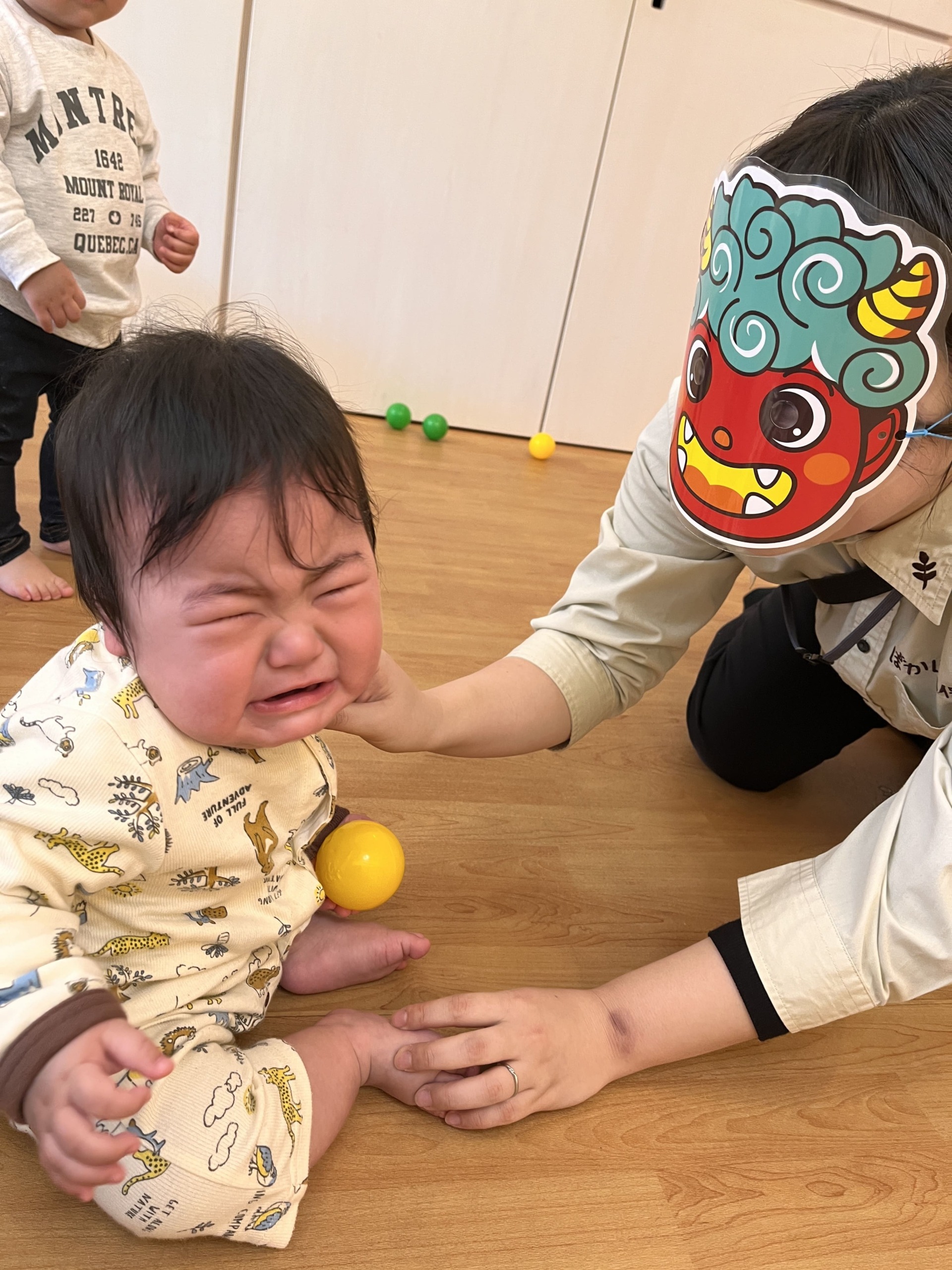 0歳児さんの様子もお伝えしますね。カラーボールを出して投げる練習をしてから、鬼のお面をかぶった職員がそっと登場しました。最初は「え、なに?」と不思議そうにしながらも、手に持っていたカラーボールを勇気を出して投げることができました。怖くないのかな?と思って低めの声で「うおぉぉ〜」と近づいてみると、途端に怖さが高まり、仁王立ちのまま大号泣で一歩も動けなくなってしまうほどでした。