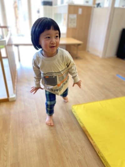 0歳児さんは、公園では、落ち葉の感触を手で確かめたり切り株に挑戦したり。先生がお手伝いすると、しっかりと足をあげてすっと登って景色を楽しむ様子があり、外の世界への興味がぐっと広がっていることを感じました。