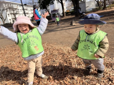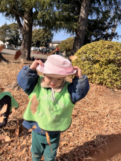 お散歩では、公園の切り株に登ってみたり、摺り足で歩いて砂がふわっと舞う様子を一緒に眺めたり、先生と落ち葉をかけ合って笑いがはじけたりと、冬ならではの感触や景色を全身で楽しみました。