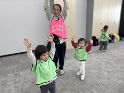2歳児さんは、バスに乗ってダンスに出かけました。いつもと違う場所だったので、はじめはちょっぴり緊張した様子でしたが、準備運動のあとにおなじみの曲が流れると、にやっと笑って体が自然と動き出しました♬「からだ☆ダンダン」や「ジャンボリミッキー」では、先生の手を離れて軽やかにステップを踏み、思いきり楽しむ姿が見られました。最後は「ぼよよん行進曲」でみんなで手をつないでジャンプ。満足そうな表情がとても印象的でした♡