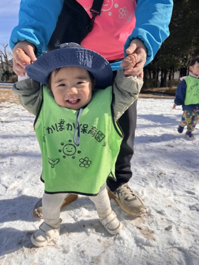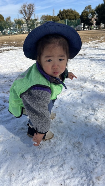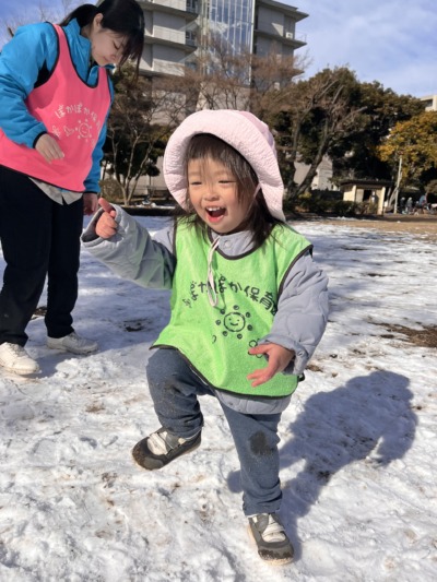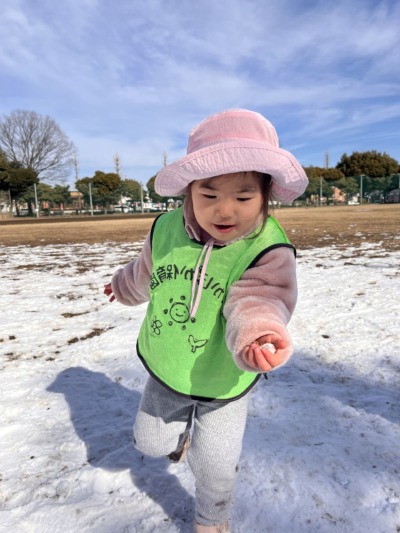 先生が雪を手ですくって、ぱらぱらっと降らせると、「きゃ〜!」と嬉しそうな声が響きました。「もう一回!」のお願いが何度も続き、繰り返しの楽しさをみんなで味わいました!雪の上を歩くのもとても上手で、転ばずに進む姿に成長を感じました。