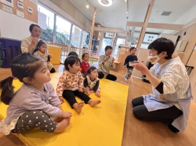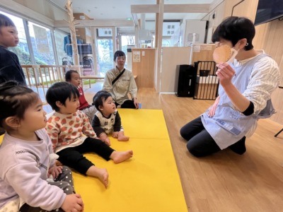 今度はビスケットの手遊びで、微細運動を取り入れ、模倣の力を促します。