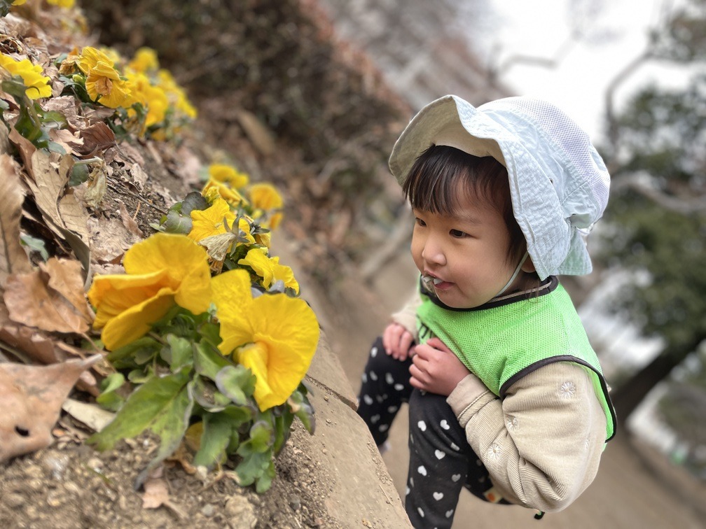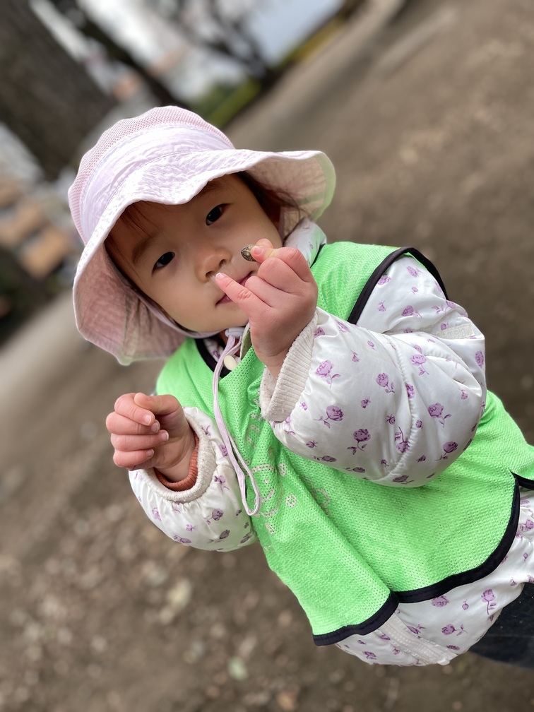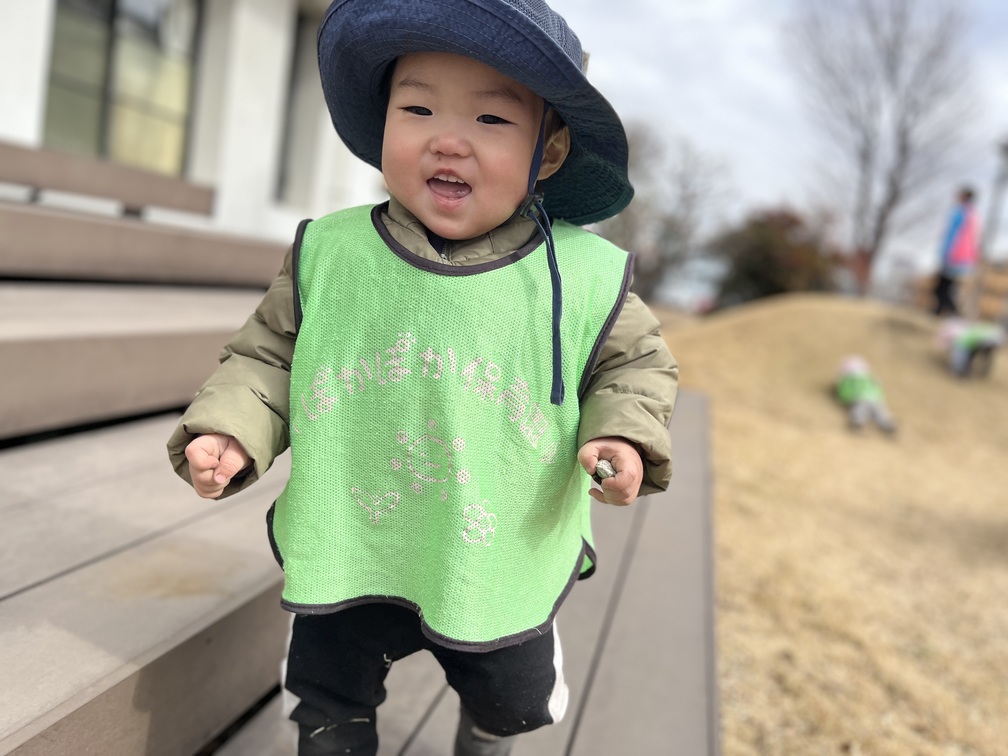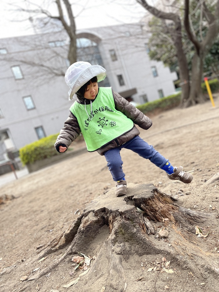 その後は近くの公園へ移動して、切り株にのぼってはおりて、を何度もくり返し楽しみました。鳩を追いかけたり、ちょっと離れて様子を眺めたりと、それぞれのペースで心地よく過ごせています。