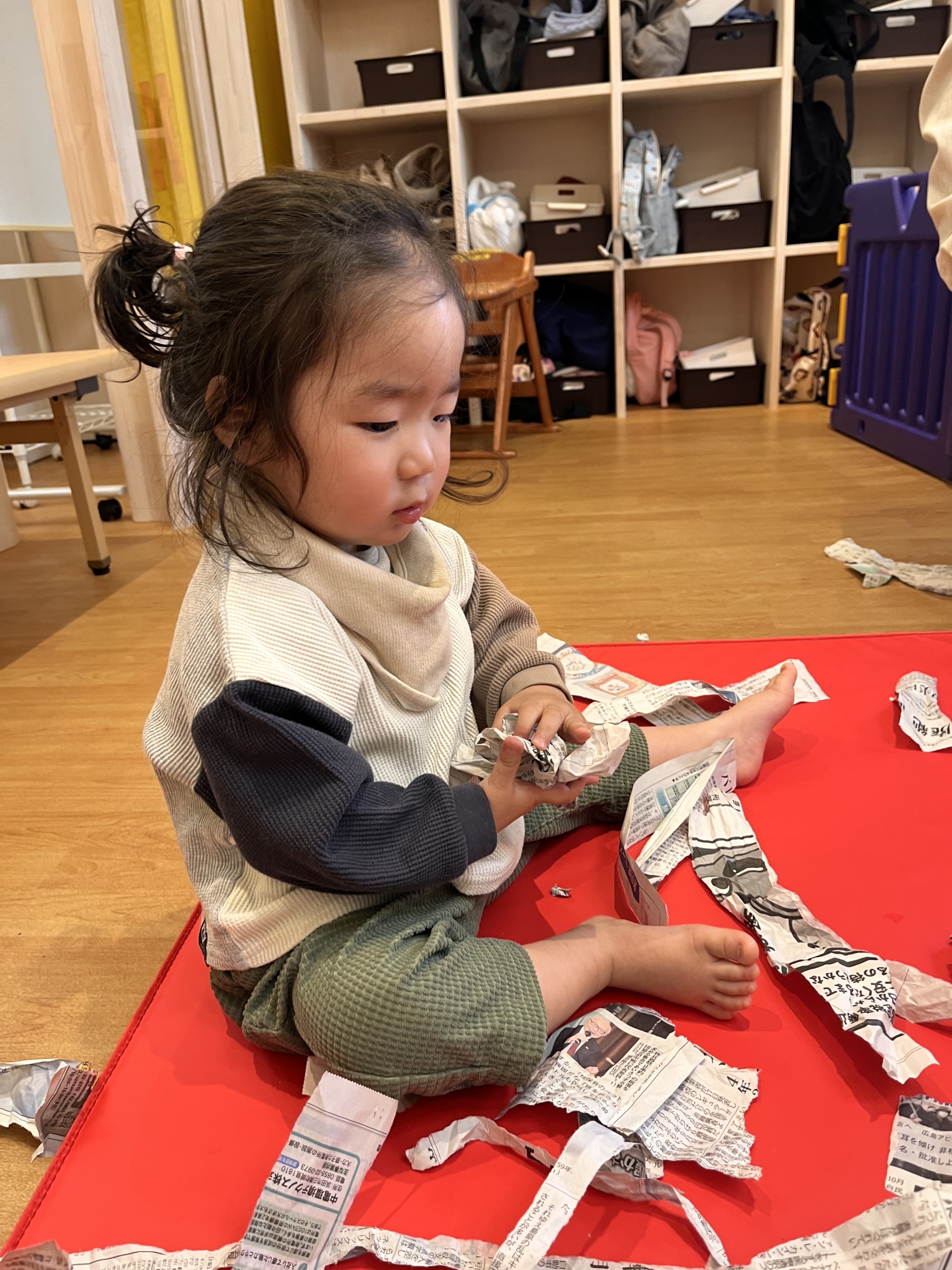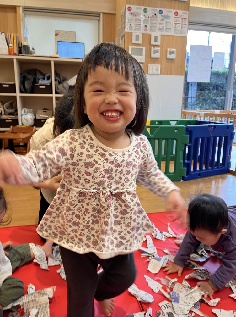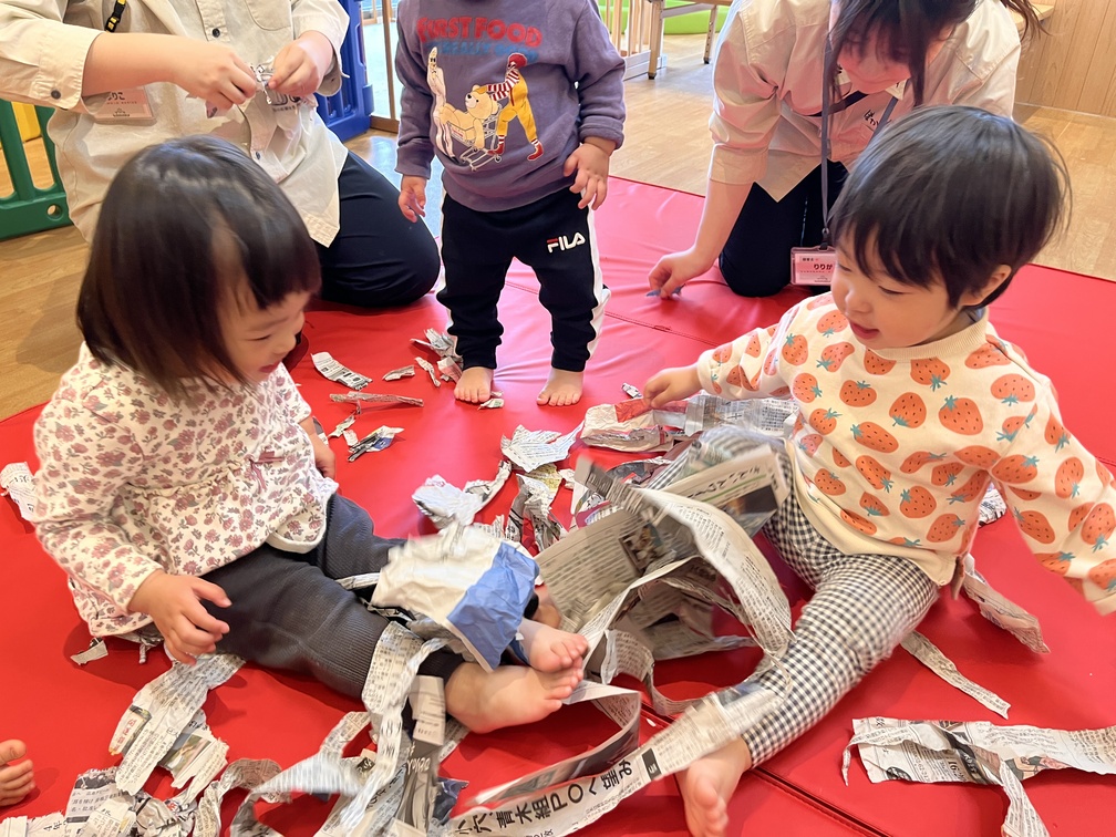 0歳児さんは、お部屋で音楽遊びを楽しみました。今日はハープの音色に耳をすませながら、新聞を使った遊びにも挑戦。新聞を帽子や靴、マントに見立ててみたり、びりびりと破る感触を味わったりしました。長い新聞紙を細く破るときには、途中で持つ位置を下にずらして、最後まで破けるように自分なりに工夫する姿も見られました。破いた新聞を袋に集めるお手伝いも大好きで、「どうぞ」と何度も運んでくれて、やり取りの温かさが伝わってきました。