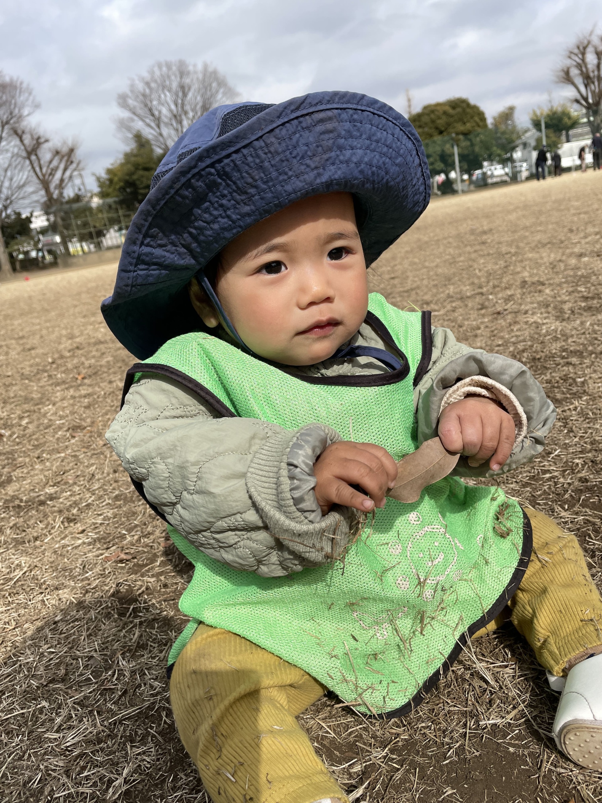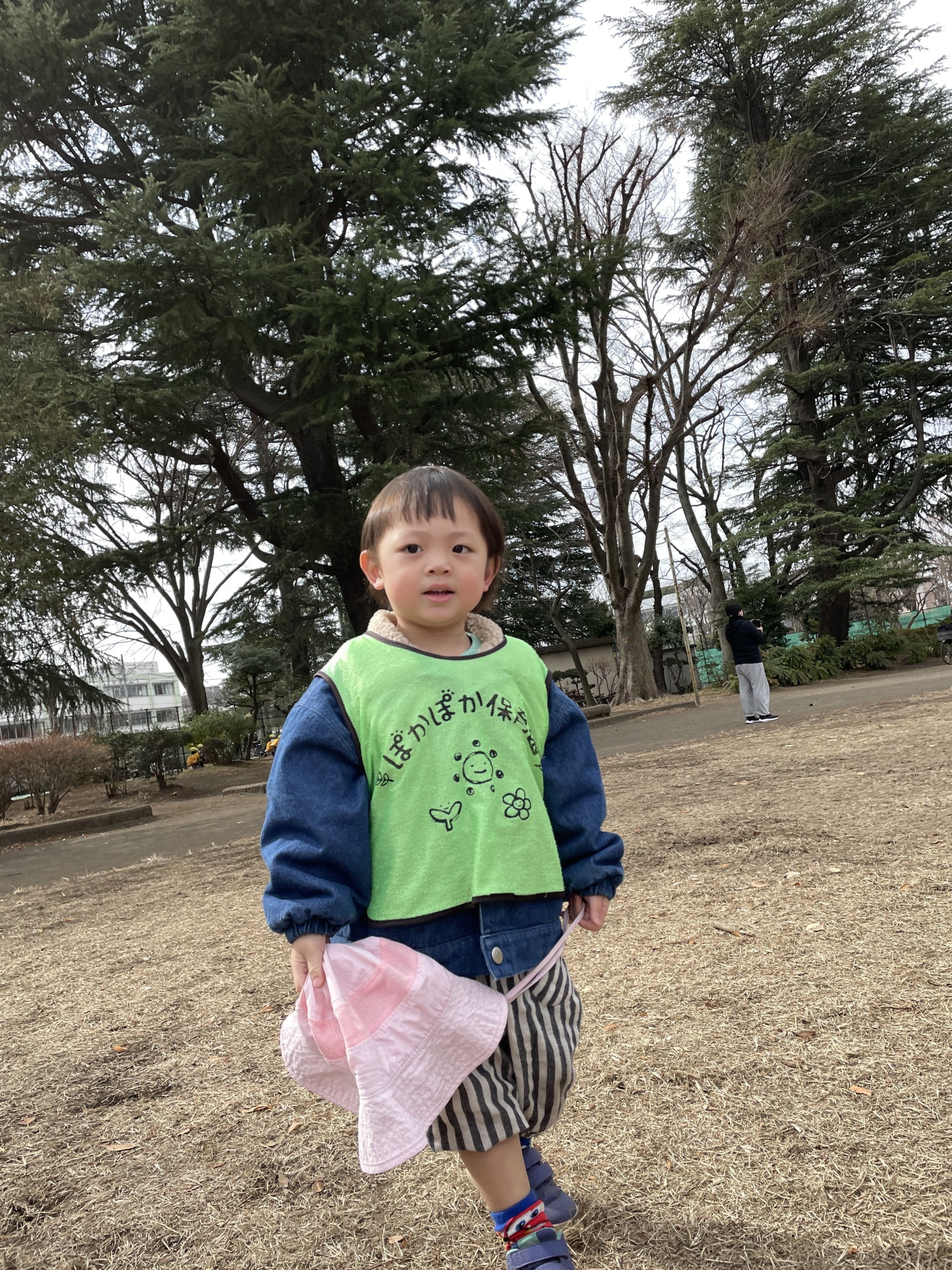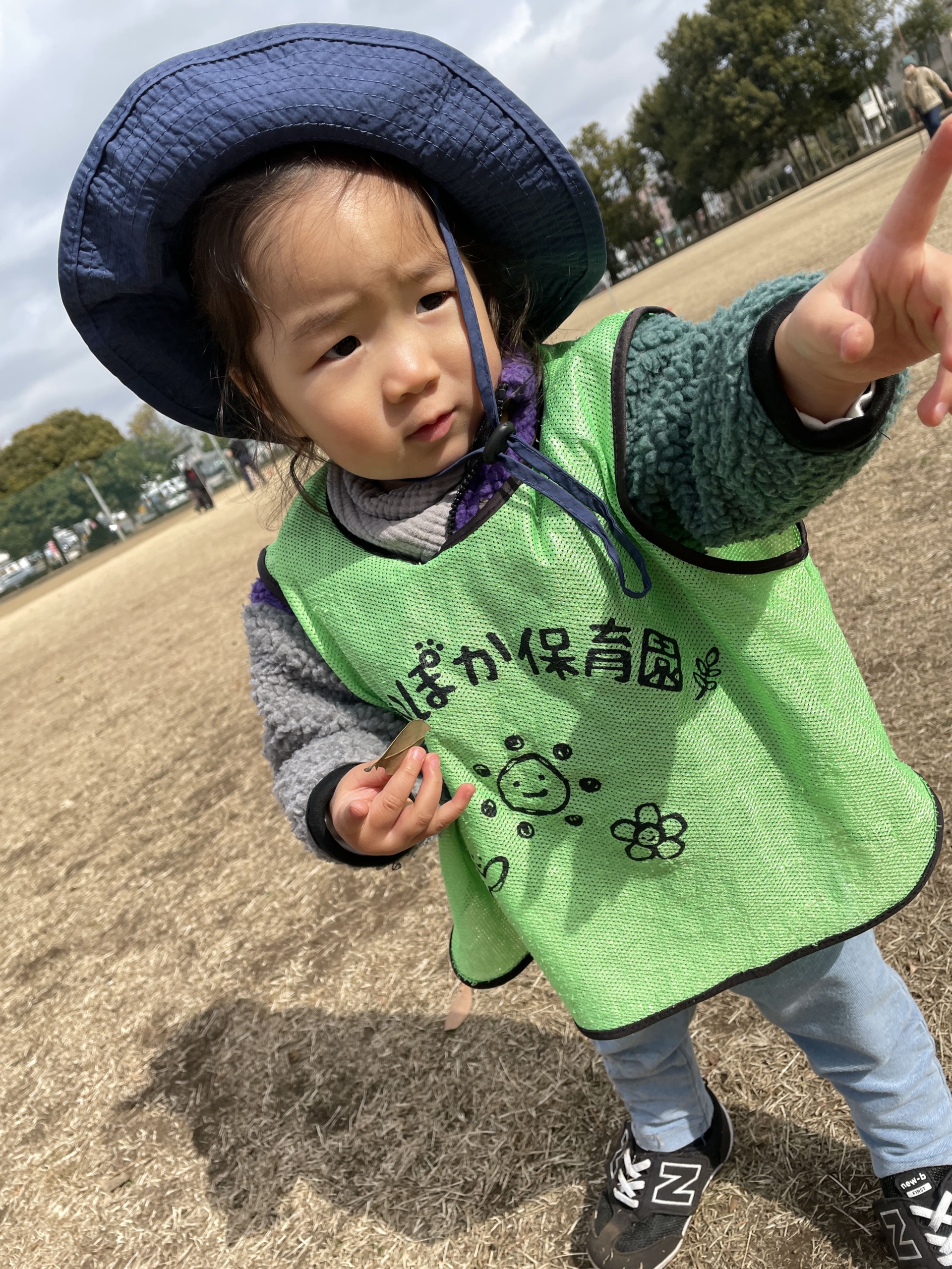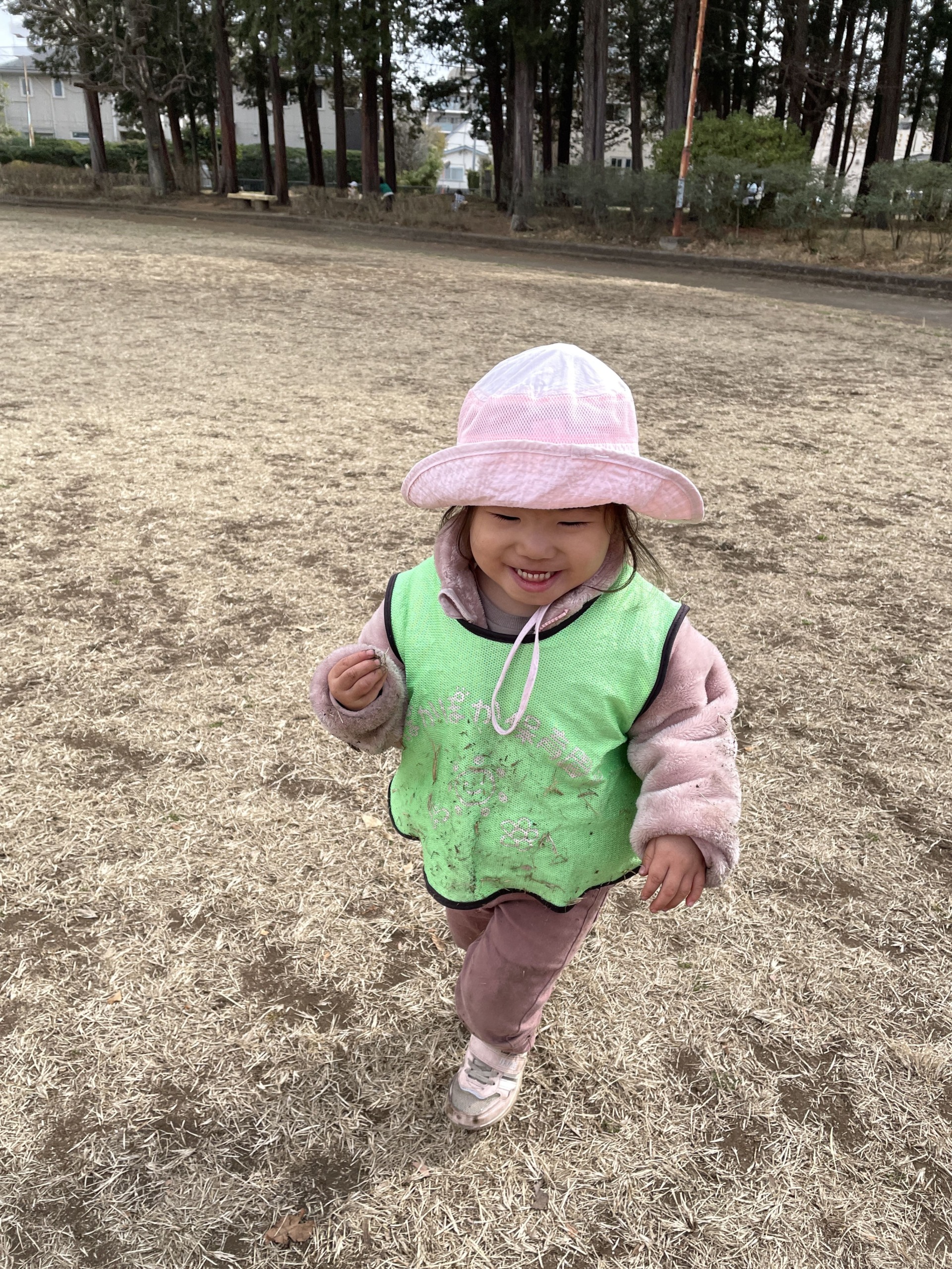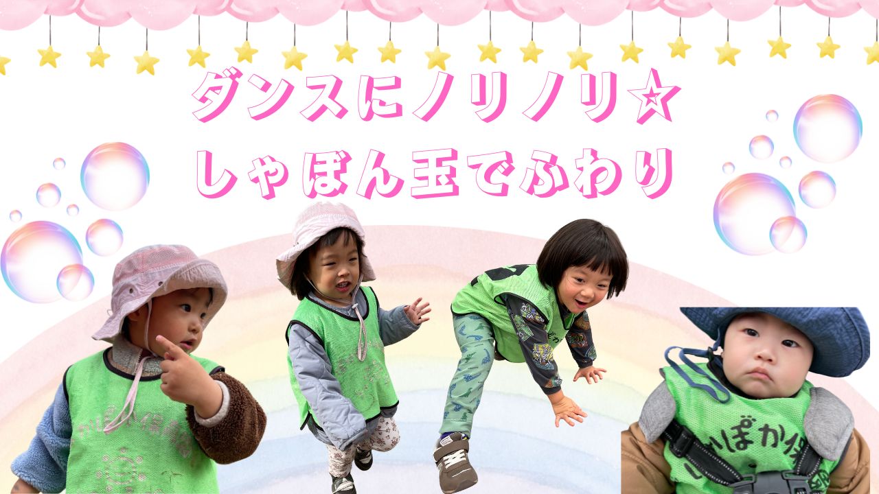 青空組さんは、公園でしゃぼん玉あそびをしました。ふわっと浮かぶしゃぼん玉を見て、「大きいの」「小さい」「もっと小さいねぇ」と、座り込んで観察する姿も。目の前で形が変わる様子にじっくりと見入っていて、サイズや数の違いに気づくまなざしがとても印象的でした。大急ぎで走って追いかけたり、そっと手を伸ばしてみたり、それぞれのペースで楽しみました。