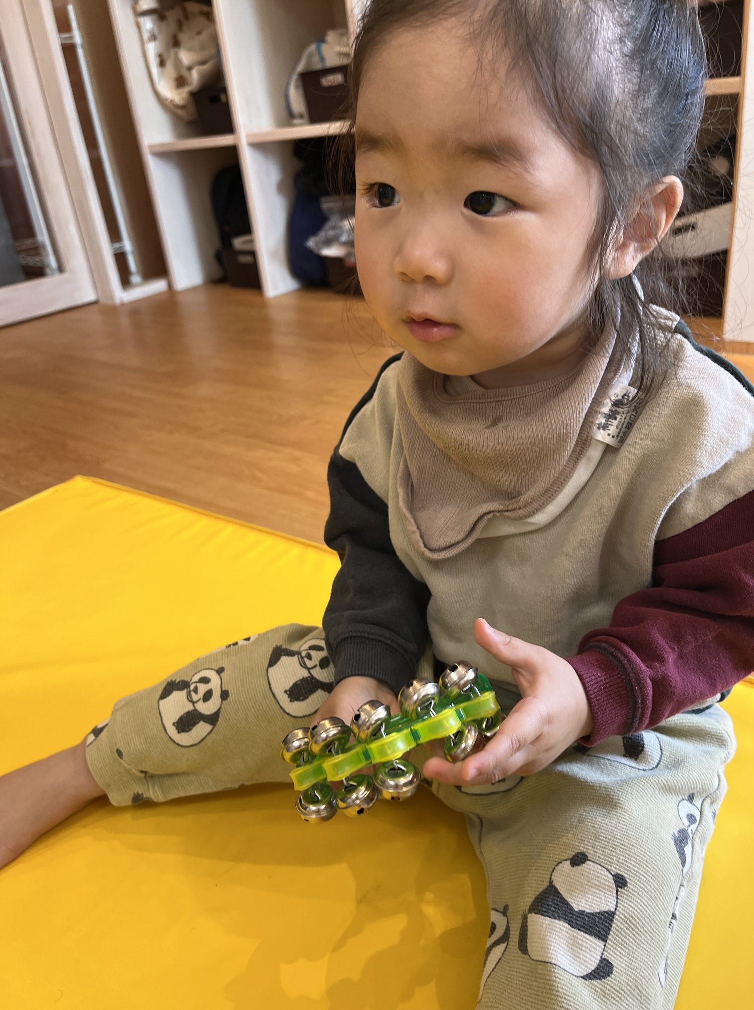 出てきたバナナとかえるの歌を、鈴でリズムを取りながら鳴らします。