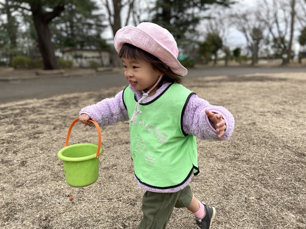 公園へ行った子はお砂場セットにワクワクし、コーン型のおもちゃに芝生を入れて「アイス!」とニコニコ。集めた芝生をバケツにためて運ぶ姿は、まるでお店屋さん。ボール遊びも「ポーン」と上手に投げ、追いかけっこも元気いっぱいでした。