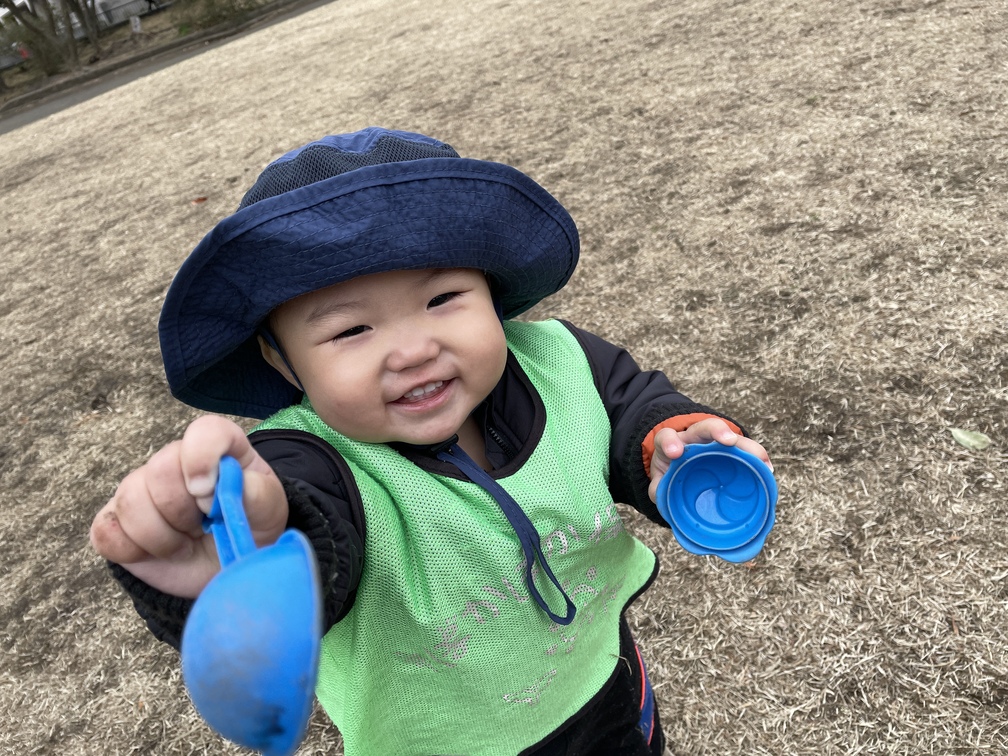 公園のグラウンドでは、ハイハイやずりばいで芝生の感触をたっぷり楽しみました。お気に入りのおもちゃをにぎにぎして感触遊びをしたり、カップに枯れ芝を集めるお手伝いをしたり、「あーん」とおままごとを一緒にするなど、穏やかな時間が流れました。お友だちのそばに行こうとする姿にも、関わりたい気持ちが育っているのを感じます。
