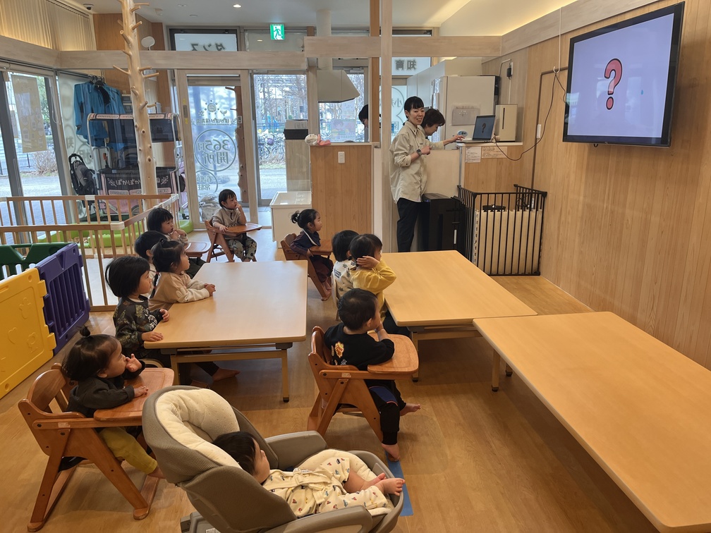 まずカリキュラムが分かれる前に全体で衛生指導(耳のお話)をおこないました。音当てクイズでパトカーの音が流れると「救急車?」と真剣に考える様子や、雷の音に驚き耳を塞ぐ姿がありました。0歳児のお友だちも耳を澄ませお話を聞き入っていました。最後にお約束事として耳の近くで大きな音を出さないこと、耳の中に物を入れないことをみんなで確認しました。