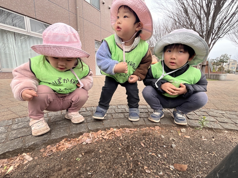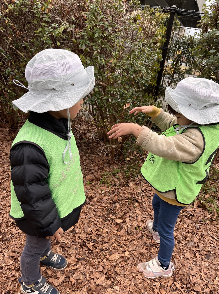 到着すると、小さな羽のある虫をみんなで観察。「手にのせたい」という声に、「チックンされちゃうよ!」と優しく教えてくれる姿に、相手を思いやる気持ちが伝わってきました。次に見つけたアリには「アリはチックンしないよね~」とお友だち同士で話し合いながらじっくり観察。小さな生き物への興味がぐんと広がっていました。