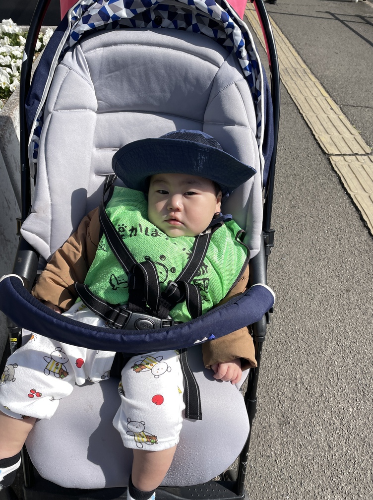 カートやベビーカーでの移動中、エレベーターの中では眉間にしわを寄せて真剣な表情で周囲を観察。外の景色をじっと追いかける様子に、興味の芽生えを感じました。