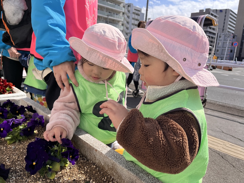 道すがら、フェンス沿いの花壇に色とりどりのパンジーが咲いていました。お花にそっと触れてみたり、指差しで教えてくれたりと、感性がきらりと光っていました。