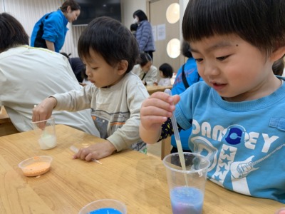 色が混ざり合う変化の面白さや、歯磨き粉が溶けていることで起きるであろう変化を、子どもたちは全身で感じ取っていました。