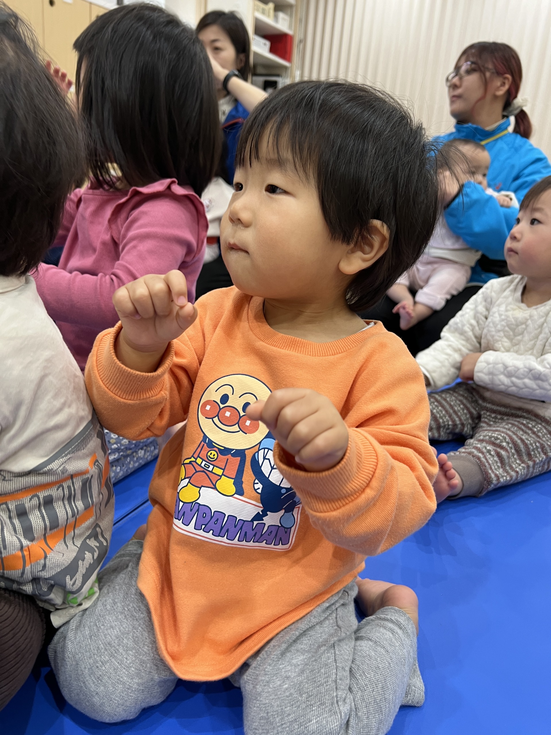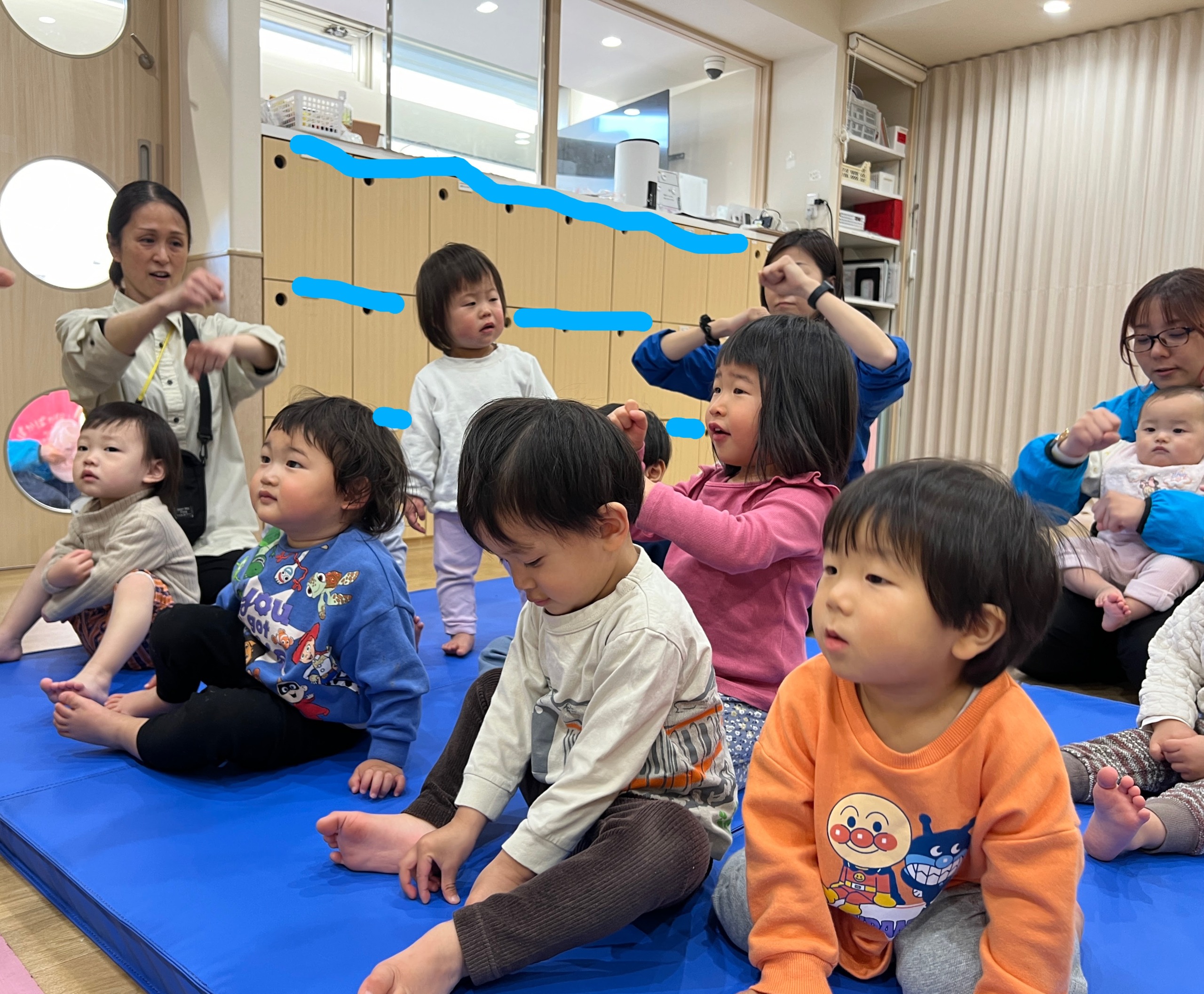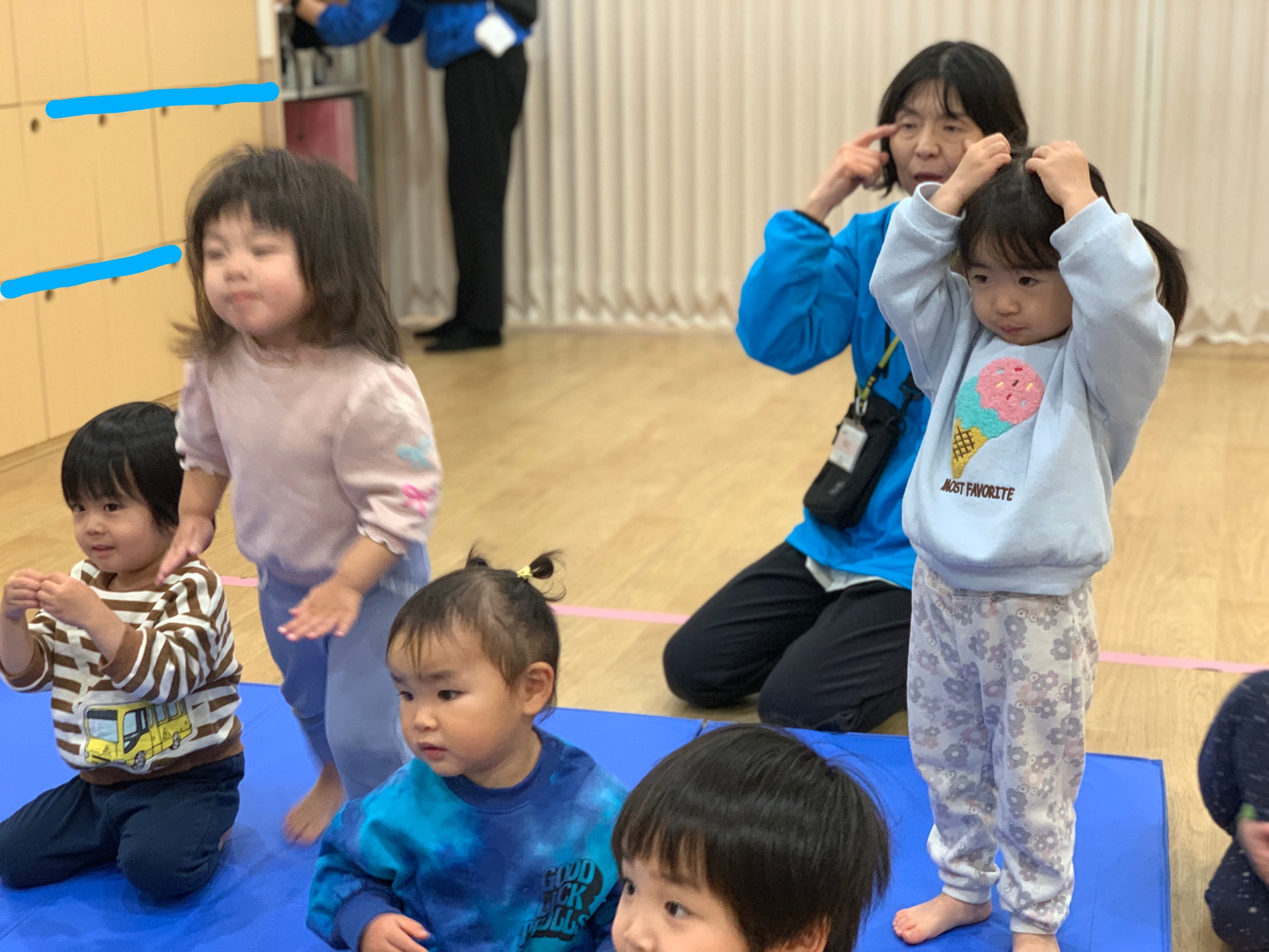 雪だるまの手遊びで、身体のあちこちを意識しながら模倣力を高めます。