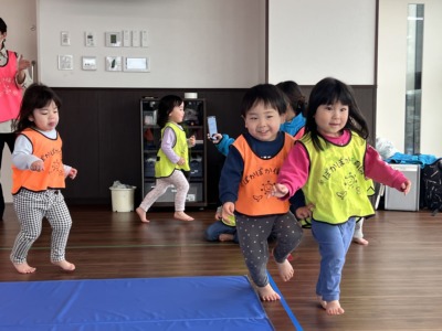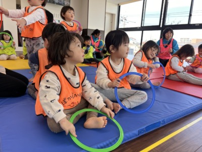 一方、虹組さん(2歳児クラス)は、バスに乗って子ども園へ音楽遊びに出かけました!
