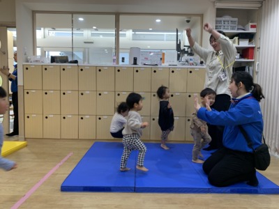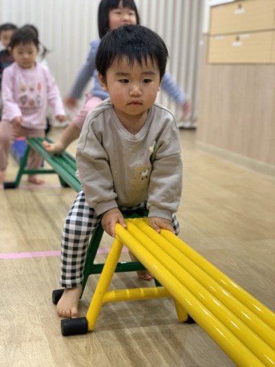 立って上手に進むことができるお友だちを見て、「ぼくも!私も!」と、目を輝かせながら挑戦する姿がたくさん見られました!