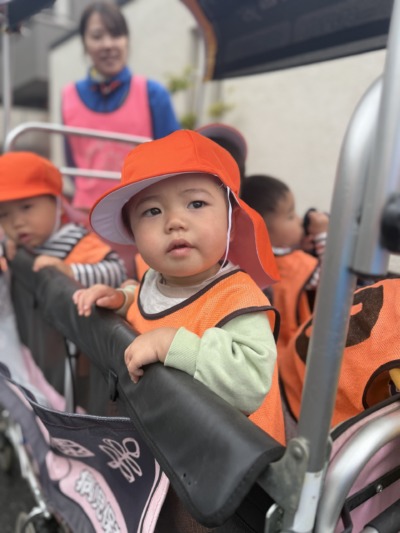 今日はあいにくの雨模様でしたが、小雨だったので、青空組さん(0歳児・1歳児クラス)はカートに乗って少しだけ周辺をお散歩に出かけました!