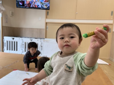 カラフルなクレヨンを手に、思い思いにぐにゃぐにゃと線を描いたり、力いっぱい色を塗ったりと、夢中になっていましたよ!