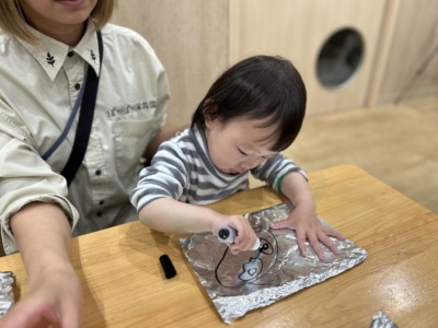子どもたちは、真っ白なアルミホイルの上に、好きな絵をホワイトボードマーカーで描きました!