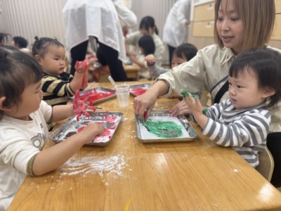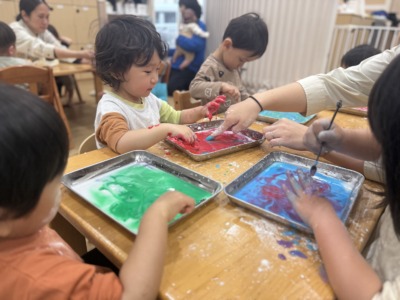 片栗粉と絵の具の活動では、素材の変化や色の面白さを全身で感じ、表現力を育みました!