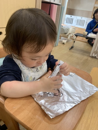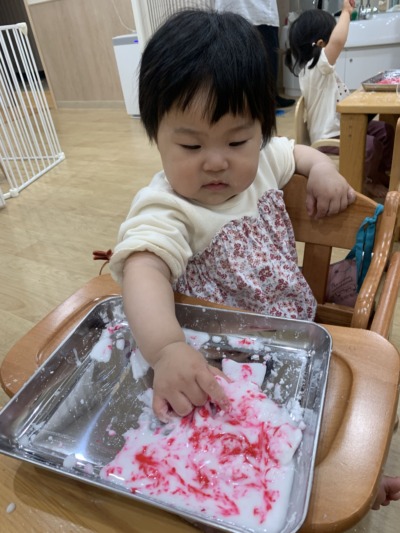 「触ってみたい!」という気持ちが抑えきれず、小さな指でそーっと触ってみたり、両手を入れてダイナミックに混ぜてみたりと、それぞれの方法で感触遊びを満喫していましたよ!