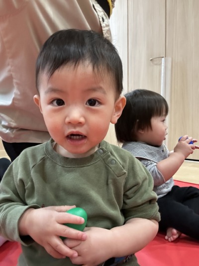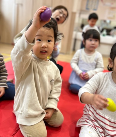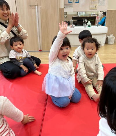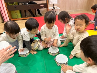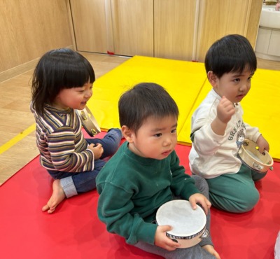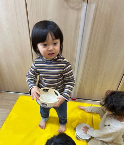 かえるの歌が聞こえたら緑マットの上で、しゃがみながらタンブリンを鳴らします。