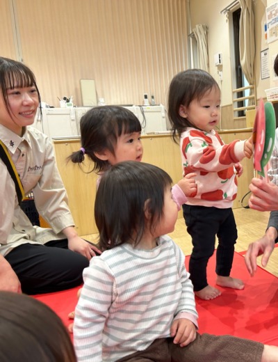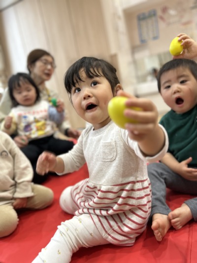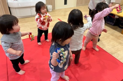 歌に出てきたかえると、バナナの歌を鈴で演奏しました。