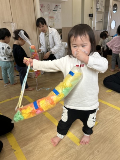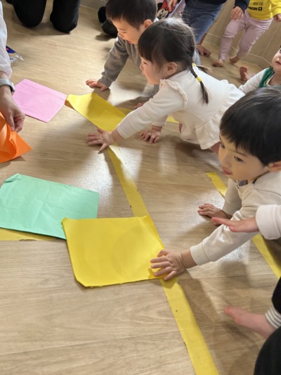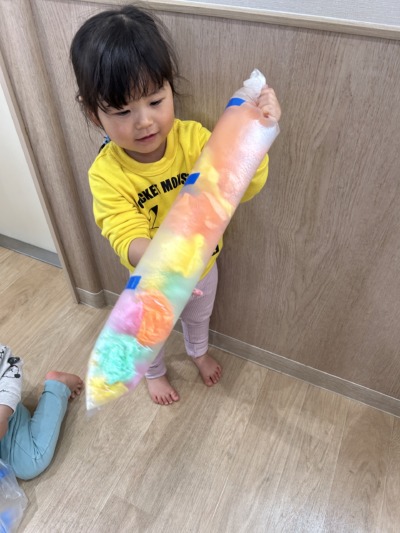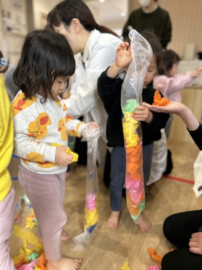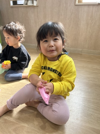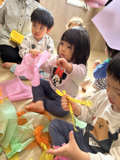 小さな手でくしゃっと握ったり、ちぎって楽しんだりする子どももいました。