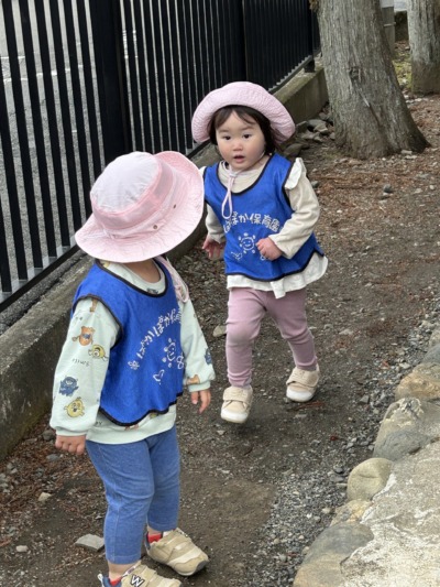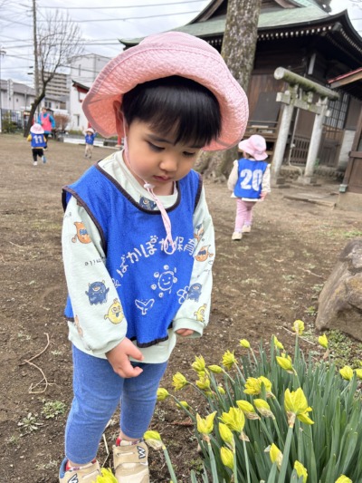「落ちないように気をつけてね」と見守る中、バランスを取りながら立とうとする姿がありました。ぐらぐらしながらも「できた!」と嬉しそうな表情。先生が「すごいね!バランス上手だね」と声をかけると、とても誇らしそうな顔を見せてくれました。また、神社の周りには小さなお花も咲いていました。それに気づいた子が「せんせい!おはな!」と教えてくれました。先生が「本当だね、かわいいね」と言うと、「かわいいね〜」と真似をして話す子どもたち。小さなお花をじっと見つめる姿から、春の自然を感じていることが伝わってきました。