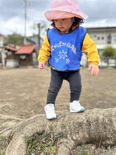 神社には大きな木があり、その根っこが地面から盛り上がっています。その根っこに気づいた子が「のぼる!」と言って挑戦。先生が