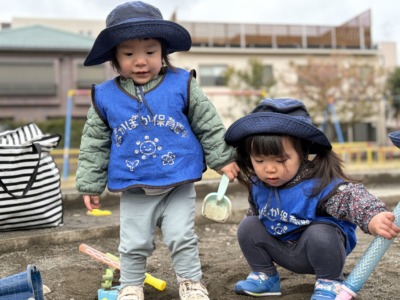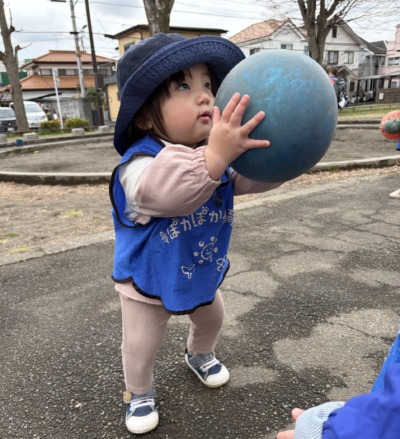 先生が「何作ってるの?」と聞くと、砂をすくいながら「んー!」と嬉しそうに見せてくれる子。言葉がまだ出なくても、表情や仕草で気持ちをたくさん伝えてくれます。スプリング遊具でも遊びました。先生が支えると、ゆらゆら揺れる遊具に乗って「きゃー!」と嬉しそうな笑い声。最初は少しびっくりしていた子も、揺れる楽しさが分かると何度も乗りたがる姿がありました。また、ボール遊びも楽しみました。先生が「ころころ〜!」と転がすと、一生懸命追いかける子どもたち。ボールを持って歩いていると、近くにいたお友だちが「なにしてるの?」というように近づいてきて、一緒にボールを触る姿も見られました。まだ小さな子どもたちですが、こうして少しずつお友だちへの興味が芽生えてきています。