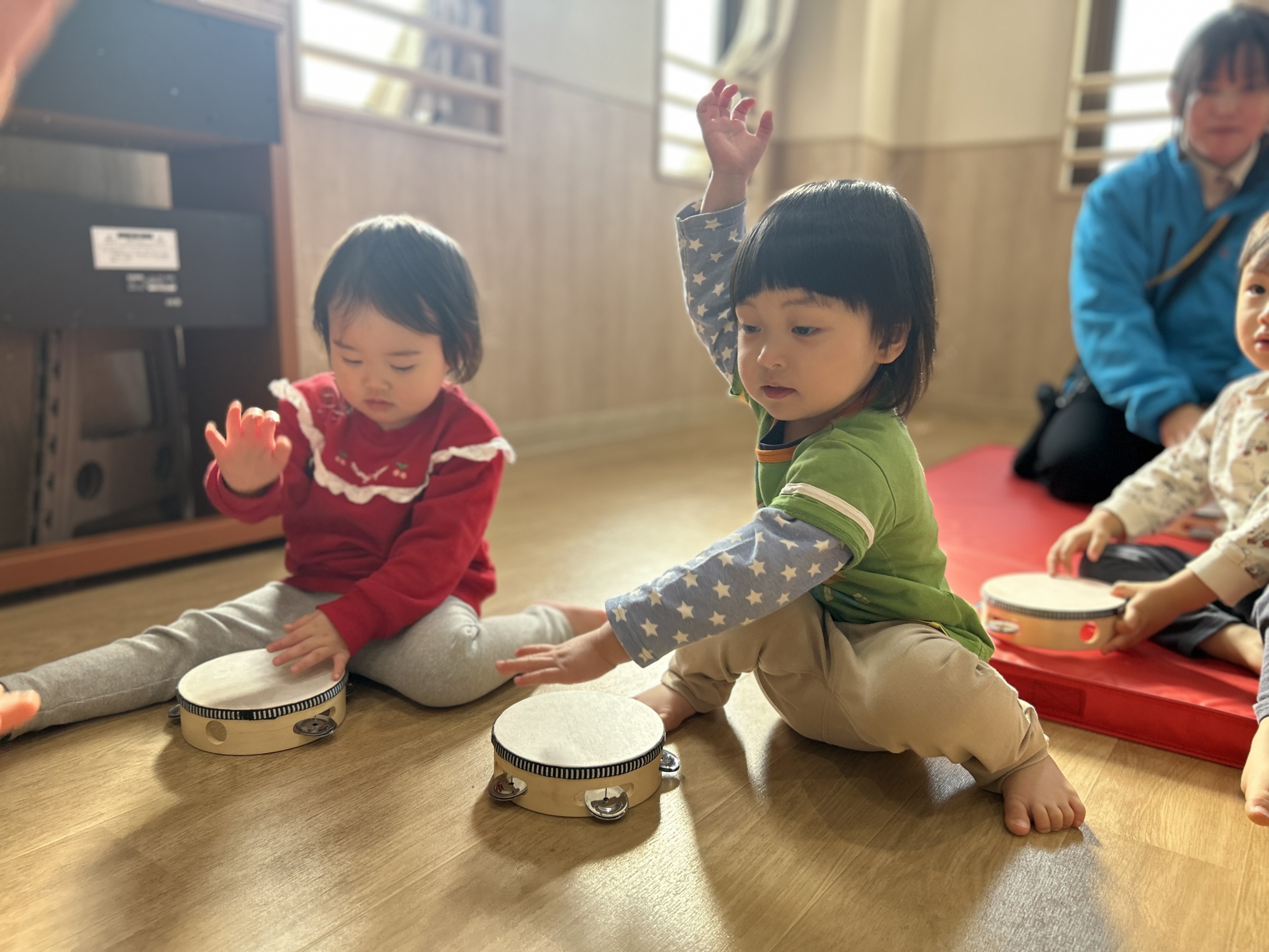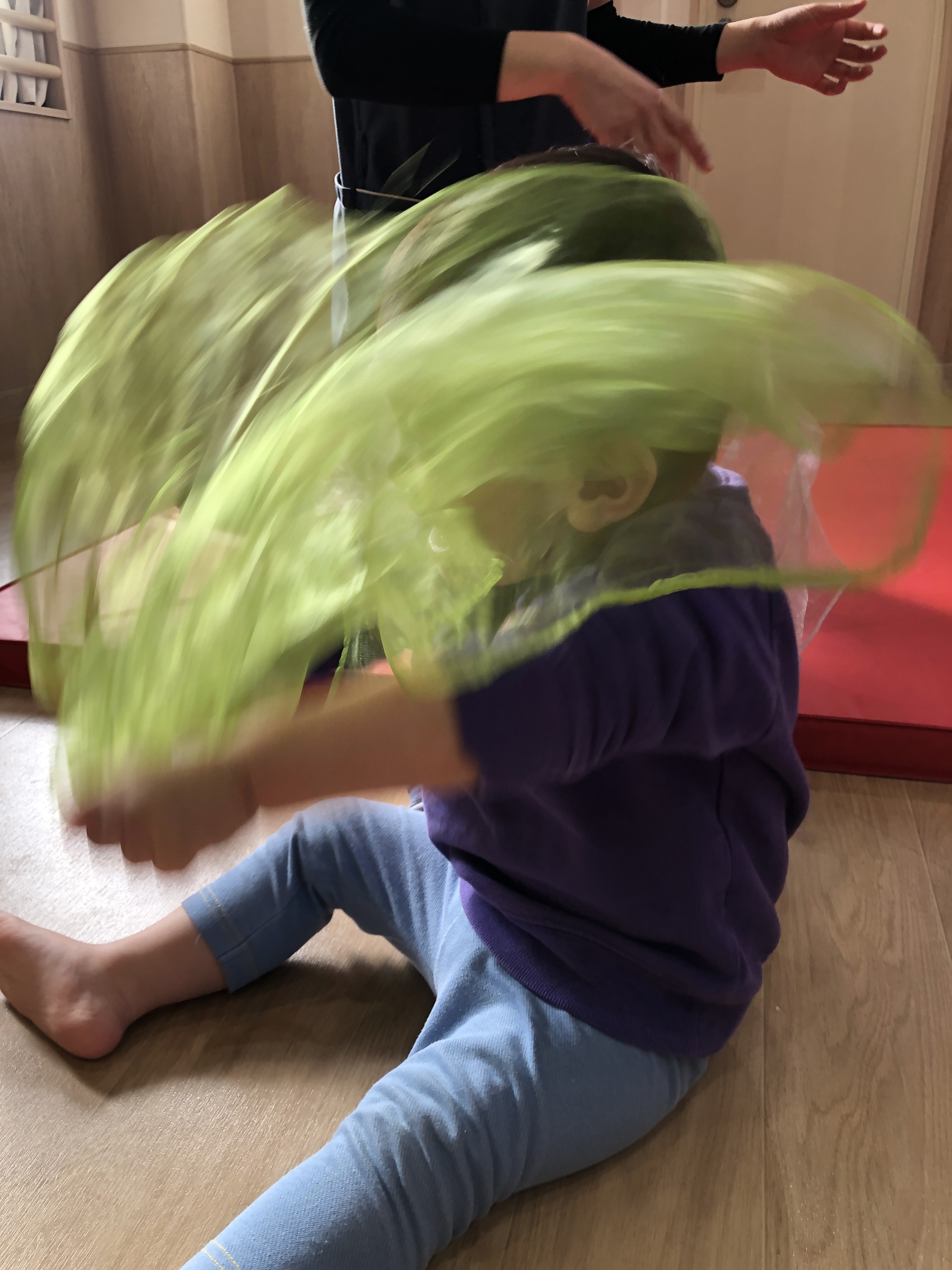タンバリンを叩いて音を鳴らしたり、季節の歌に合わせてスカーフをふわっと上にあげたり、頭からかぶったりと、全身で音を感じながら楽しみました。