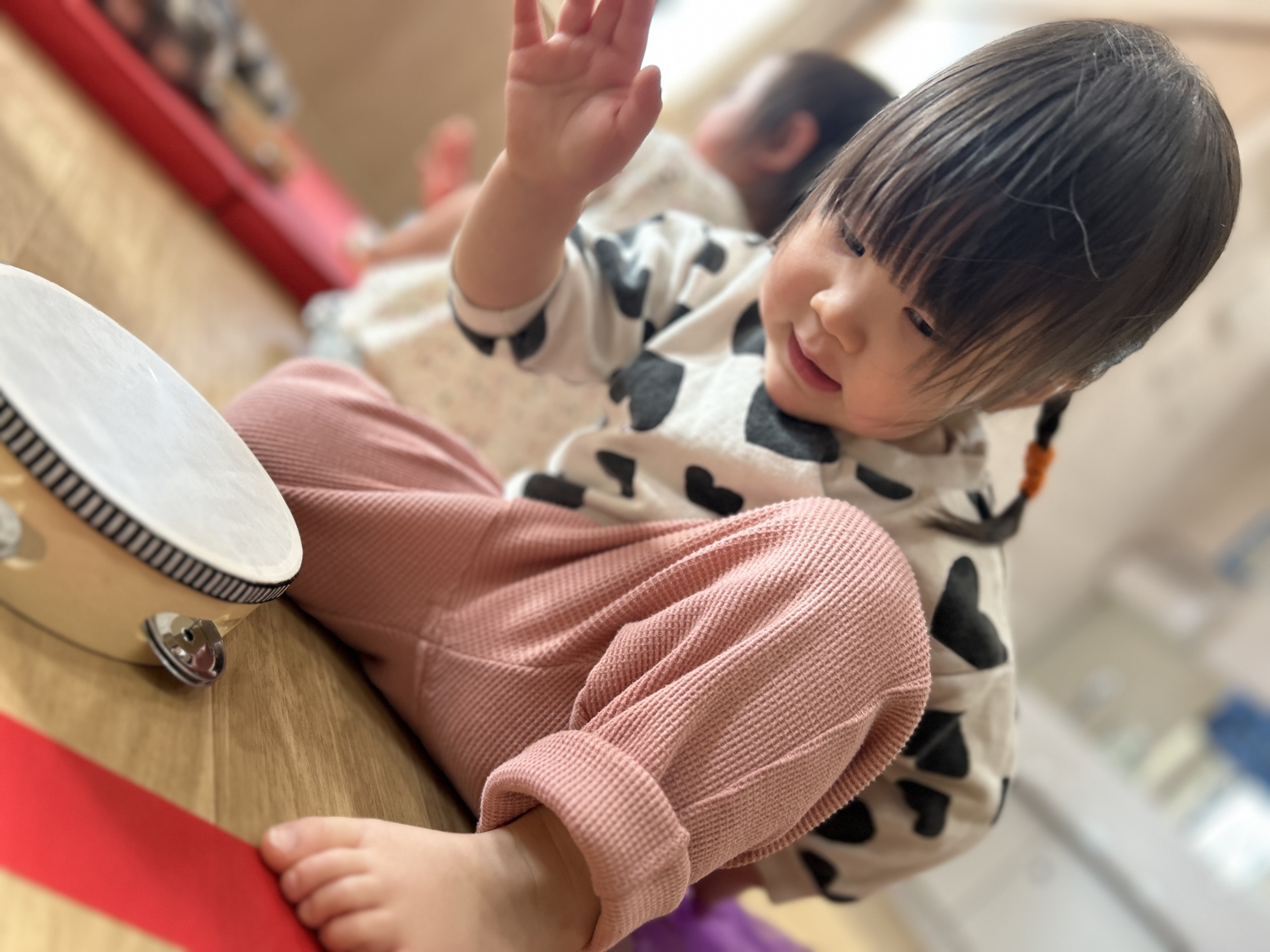 お部屋に入ると、子どもはにこにこ笑顔で一日がスタートしました。毎週火曜日は音楽のカリキュラムの日。