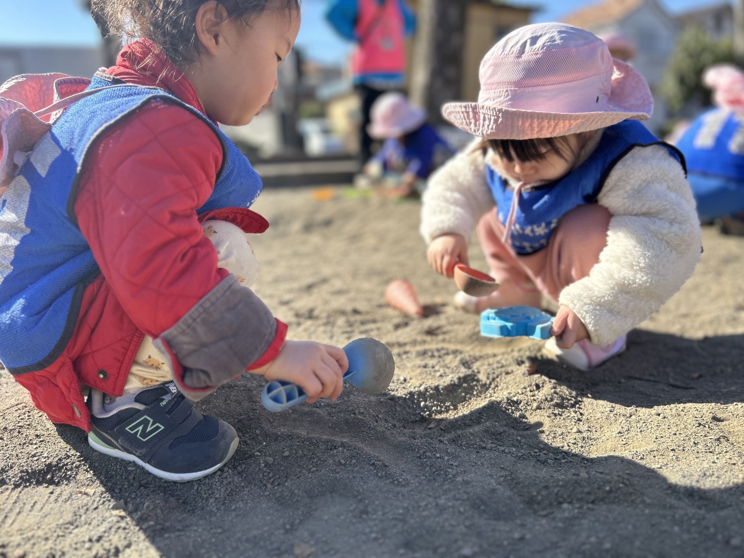 お砂場でシャベルを使って掘ったり、カップに砂を入れたりと、それぞれが好きな遊びを見つけて楽しみました。