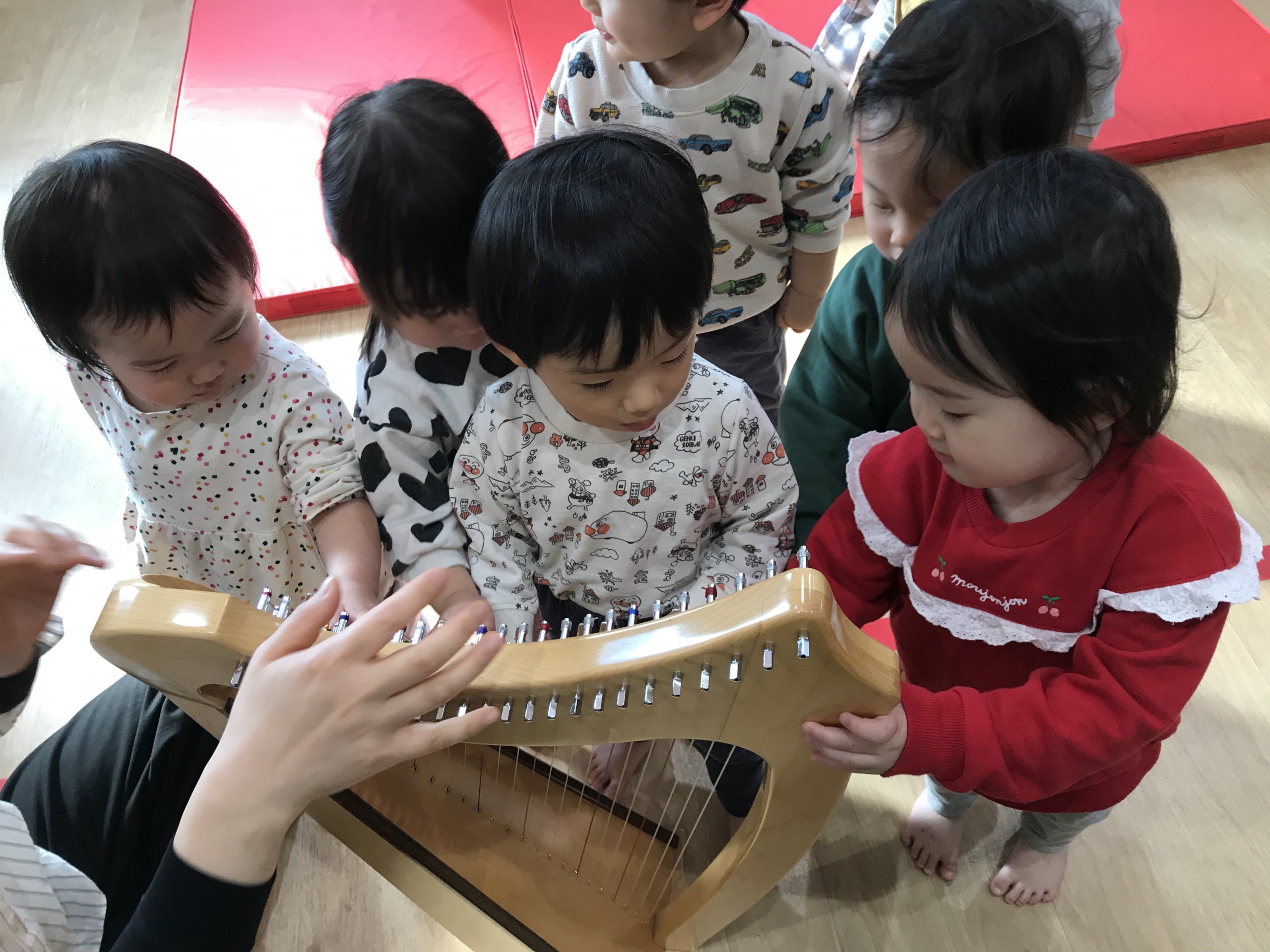 今日はハープの音色を楽しみました。やさしく響く音に耳をすませながら、音が鳴ると走って、止まるとピタッと止まる子どもたち。