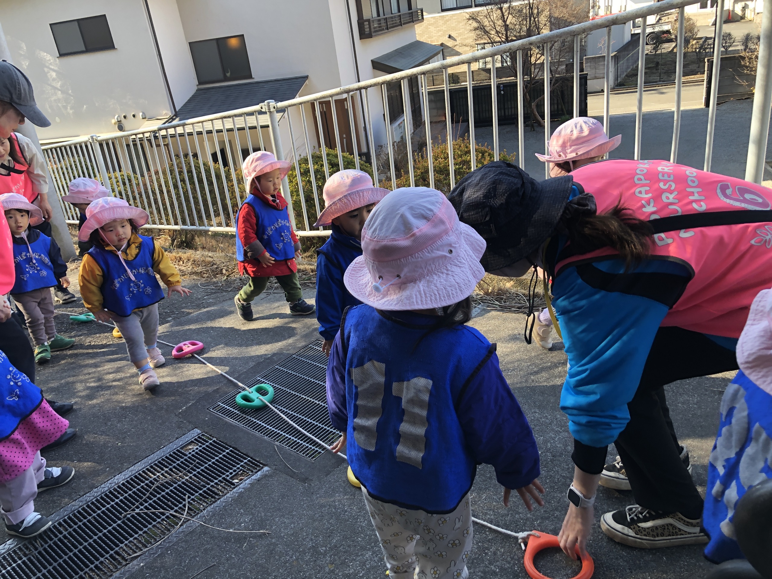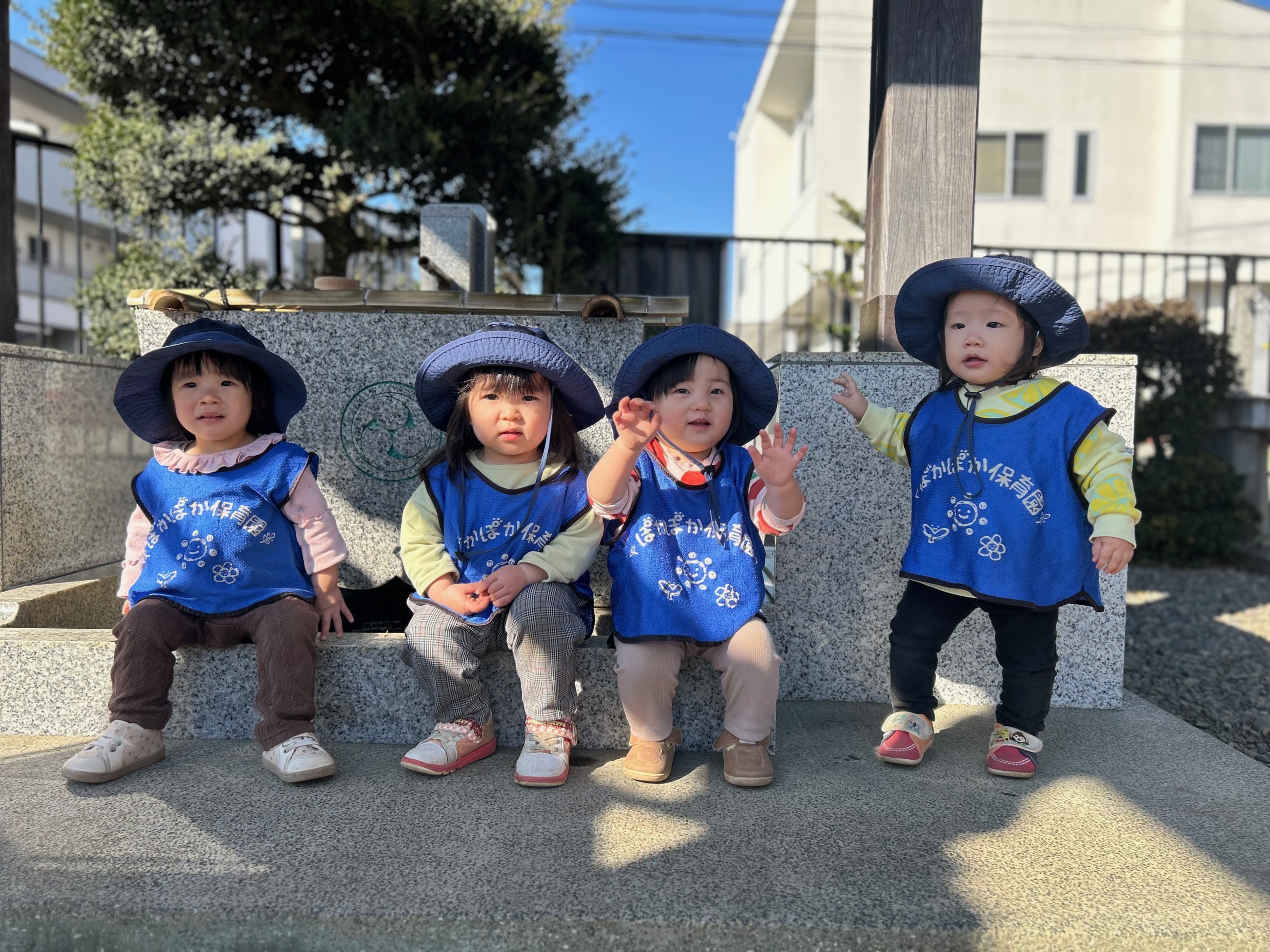 0歳児さんは、先生と一緒に神社までお散歩です。