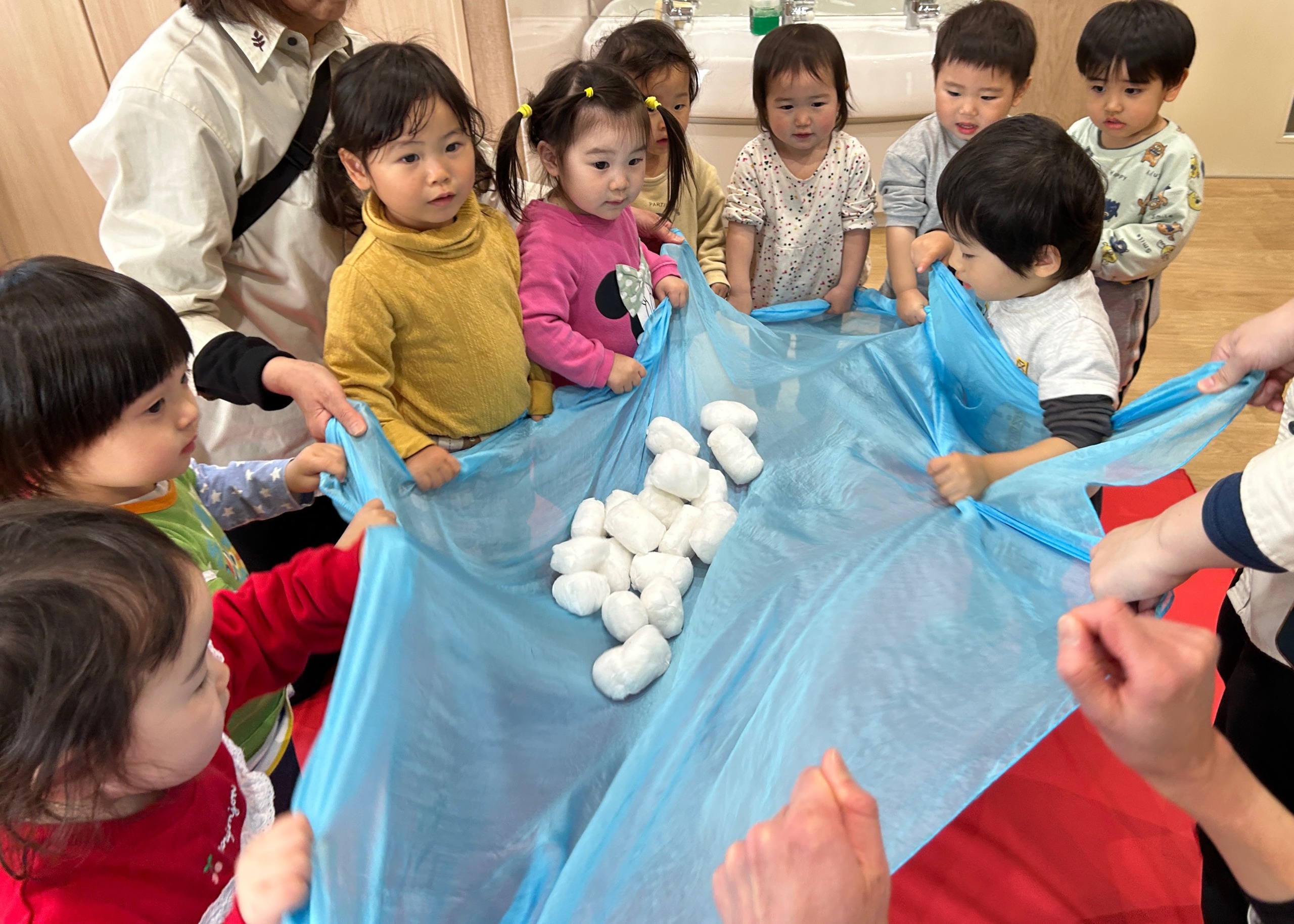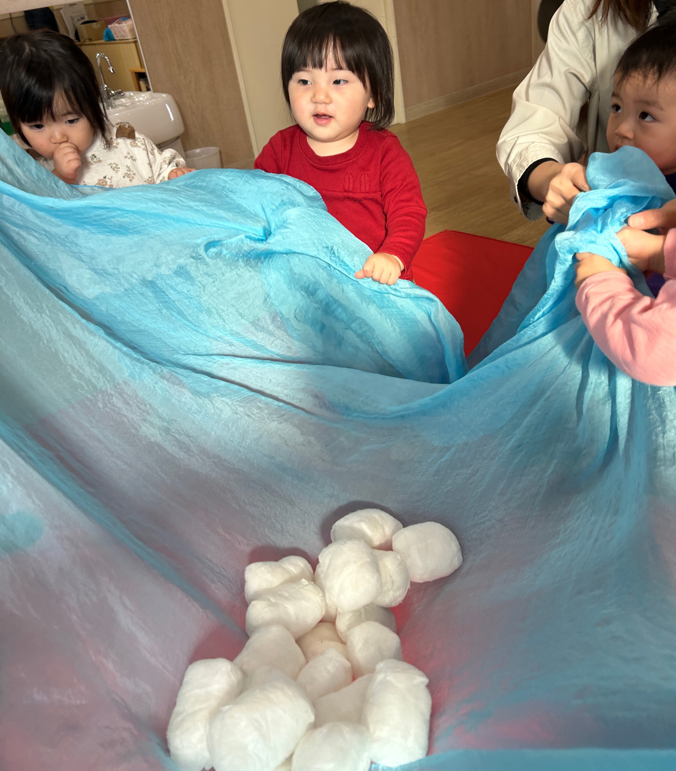 空に見立てた大判スカーフに雪玉をのせて、そーっと揺らします。
