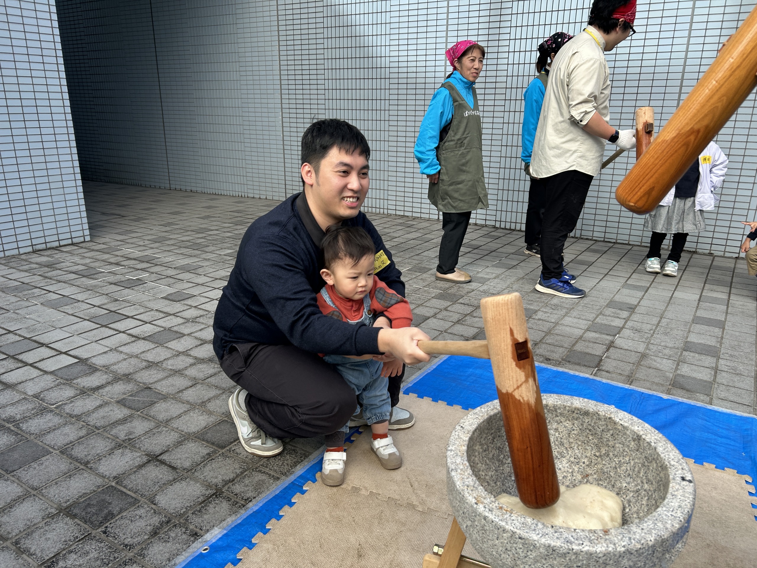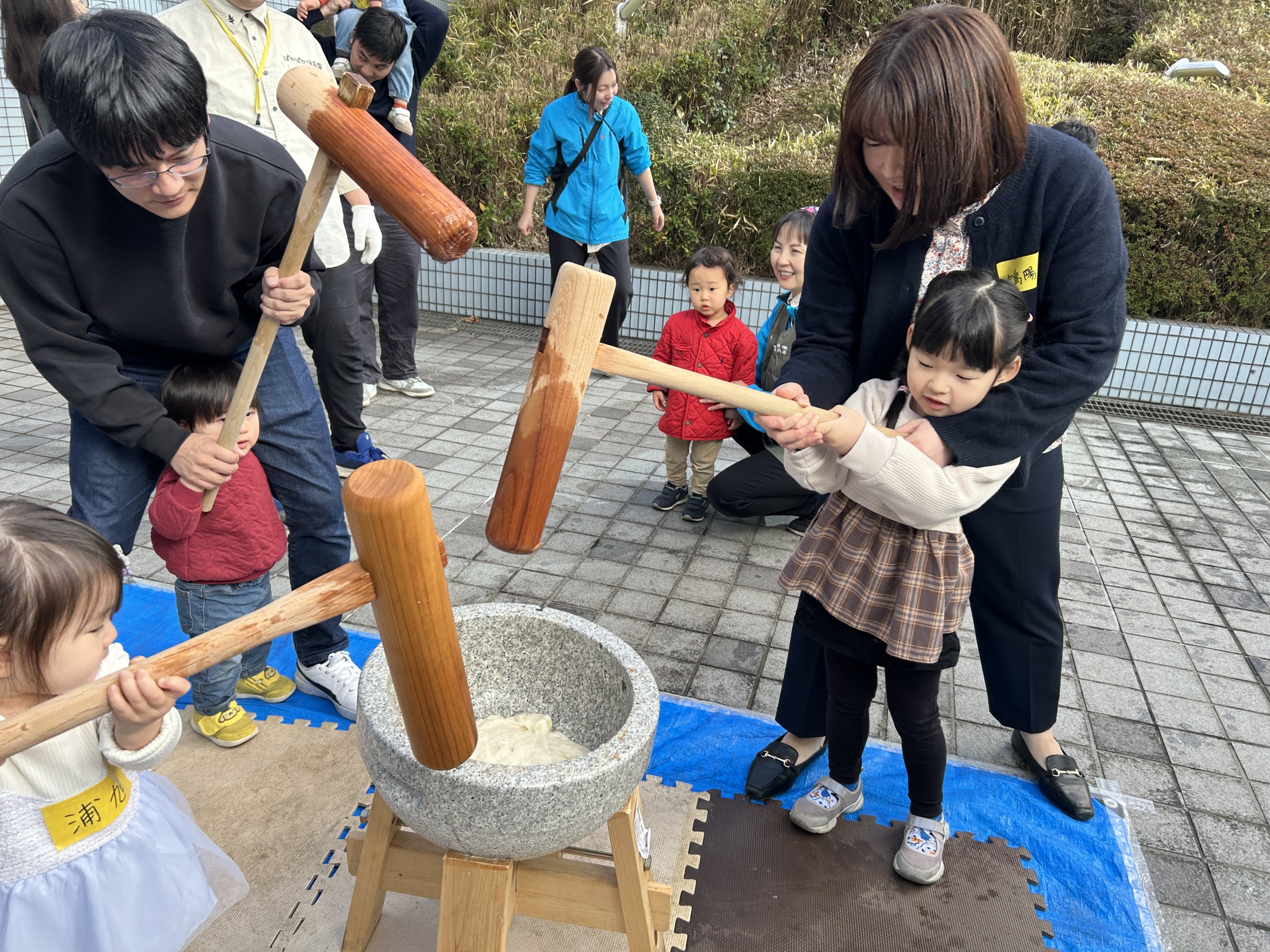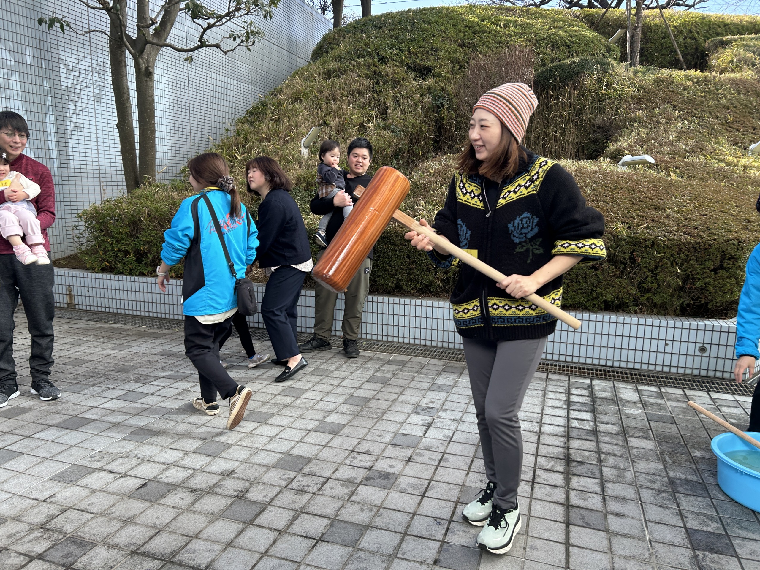 今日は特別に、パパやママにも参加してもらい、みんなで一緒にお餅つきを行ったよ。