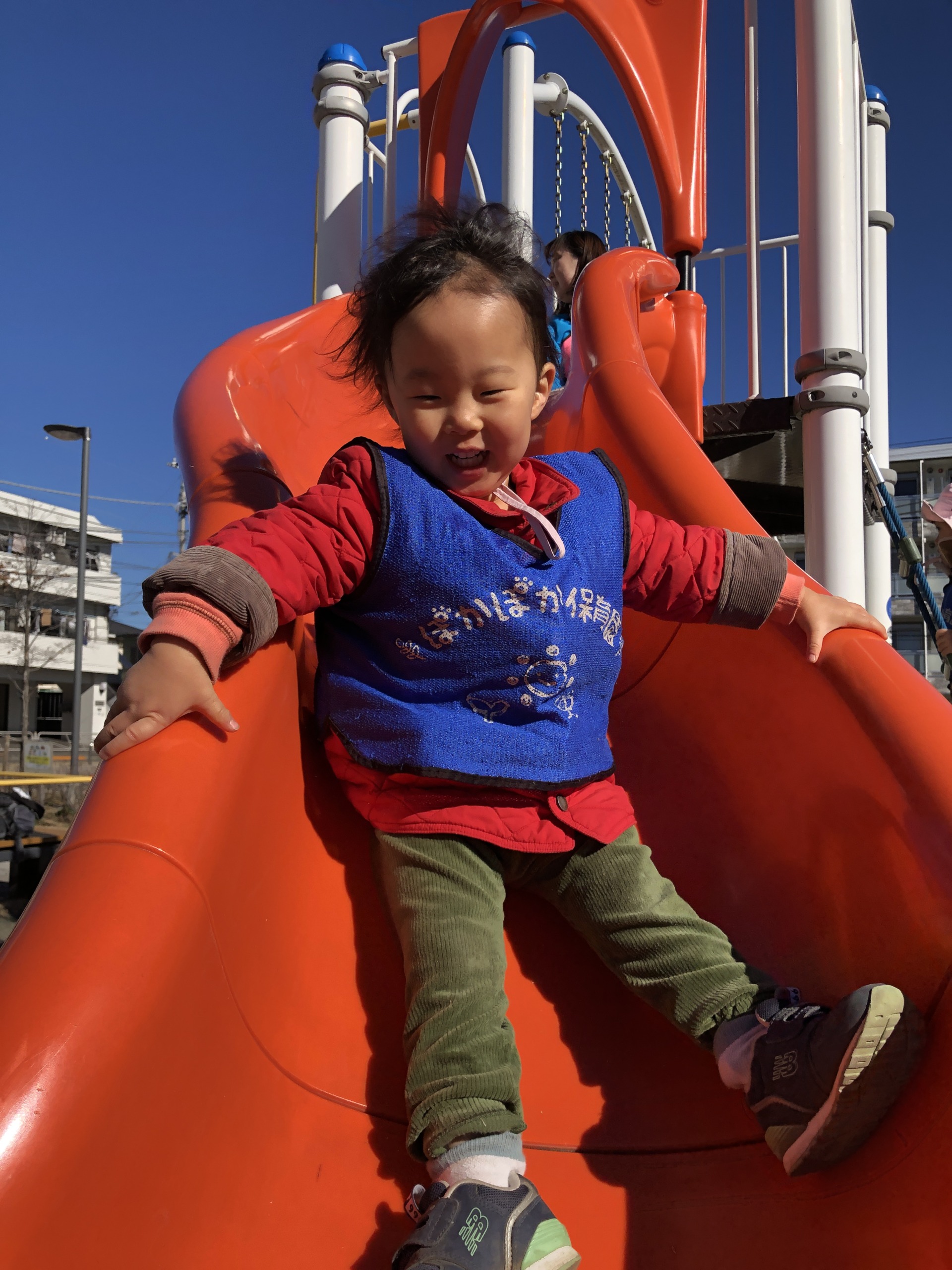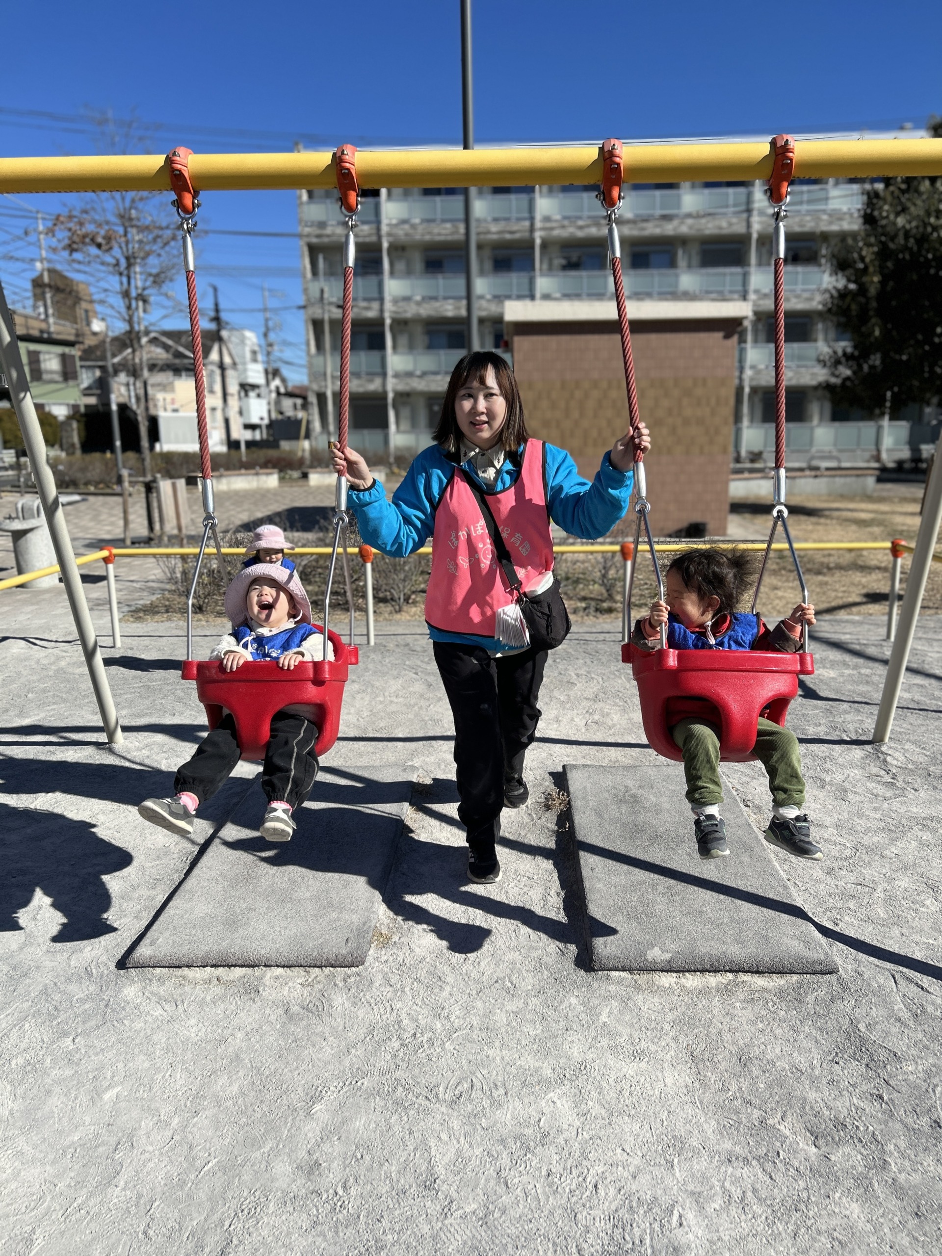 ブランコが揺れると、まるでジェットコースターのようで、「きゃー!」と声をあげて大笑いする姿も。