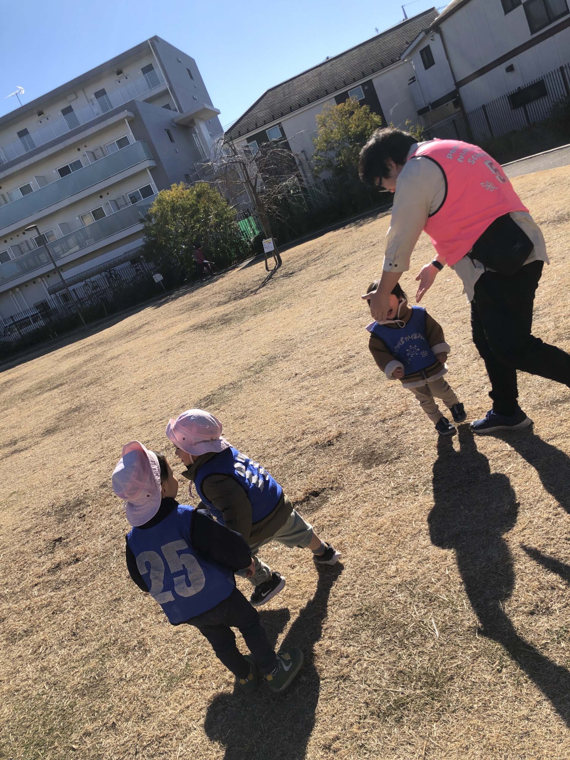 まずは広い原っぱへ。先生が「まてまてー!」と声を出すと、子どもたちは「きゃはは!」と笑いながら一斉に走り出します。