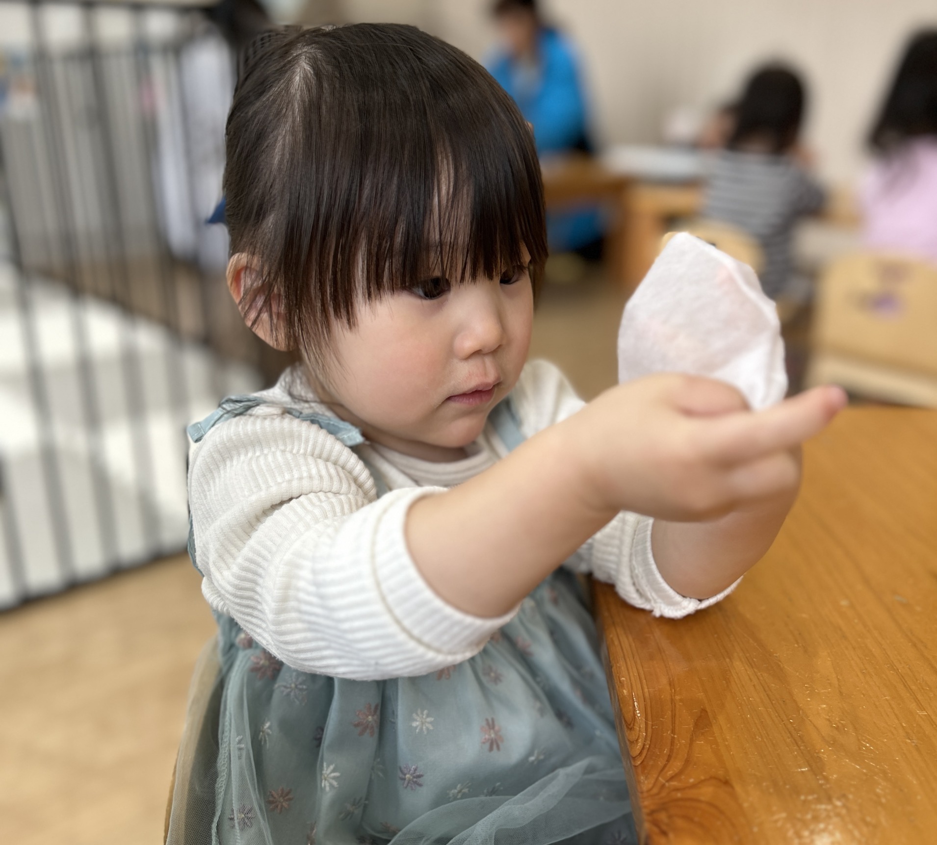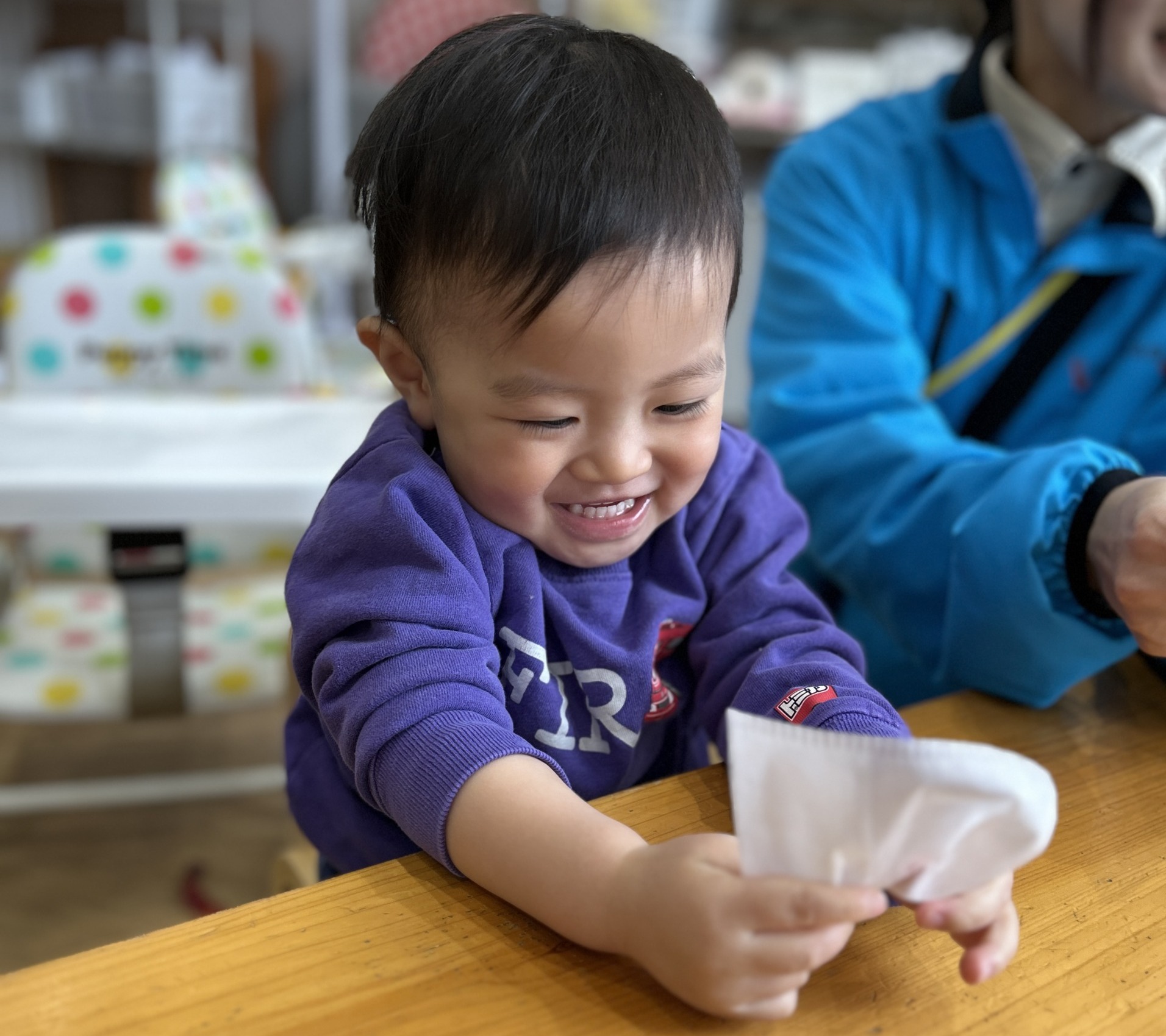 1歳児さんは、 お茶パックを広げてみることにも 挑戦。 両手で引っぱると、 少しずつ大きくなる様子に 目を丸くしていたよ。