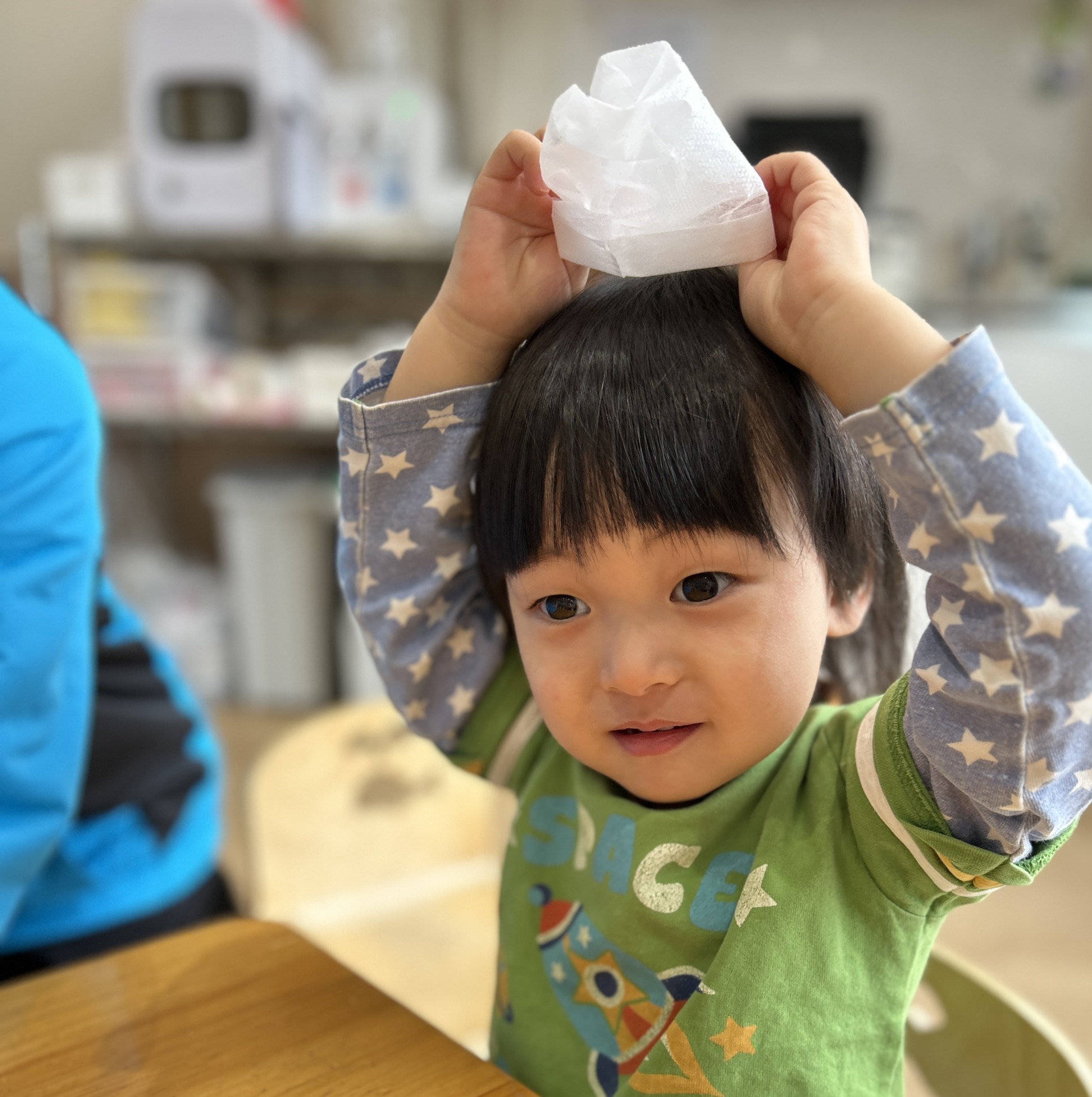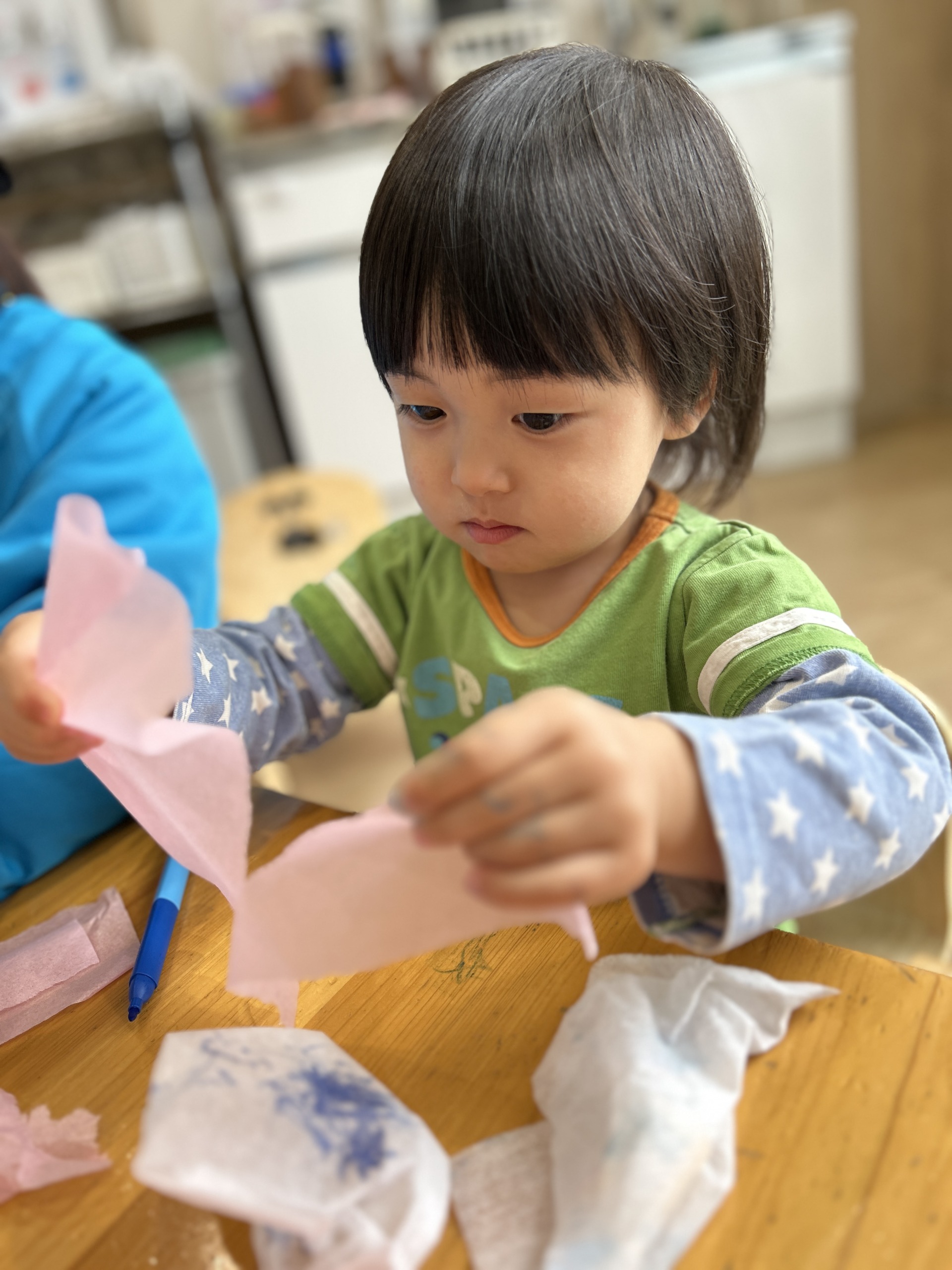 「びりびりしてみる?」 と声をかけると、 両手でくしゃっとしたり、 少しずつ引っぱってみたり。