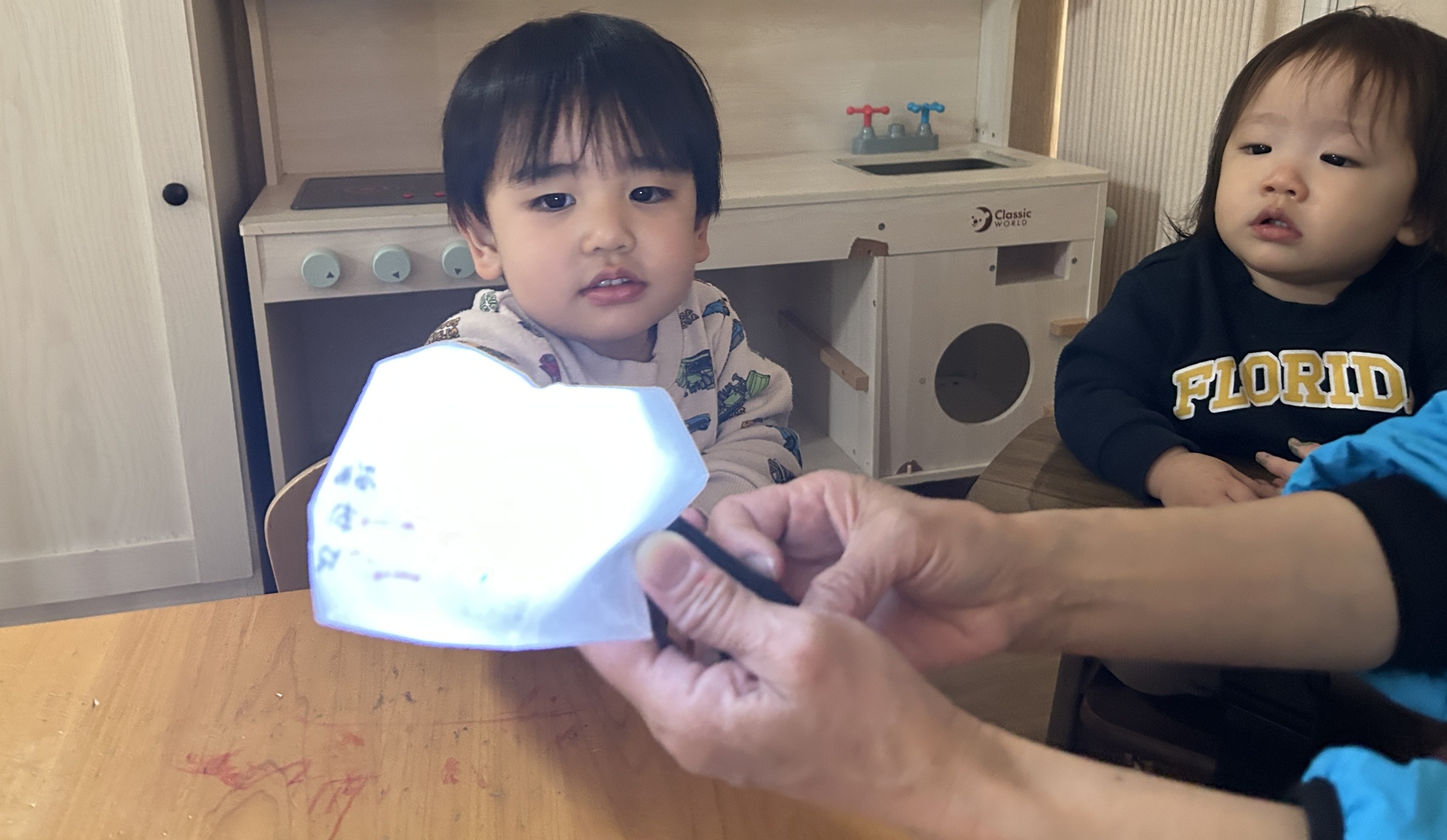 「わあ!」 「ひかってる!」 子どもたちの声が、 お部屋いっぱいに 広がったね。